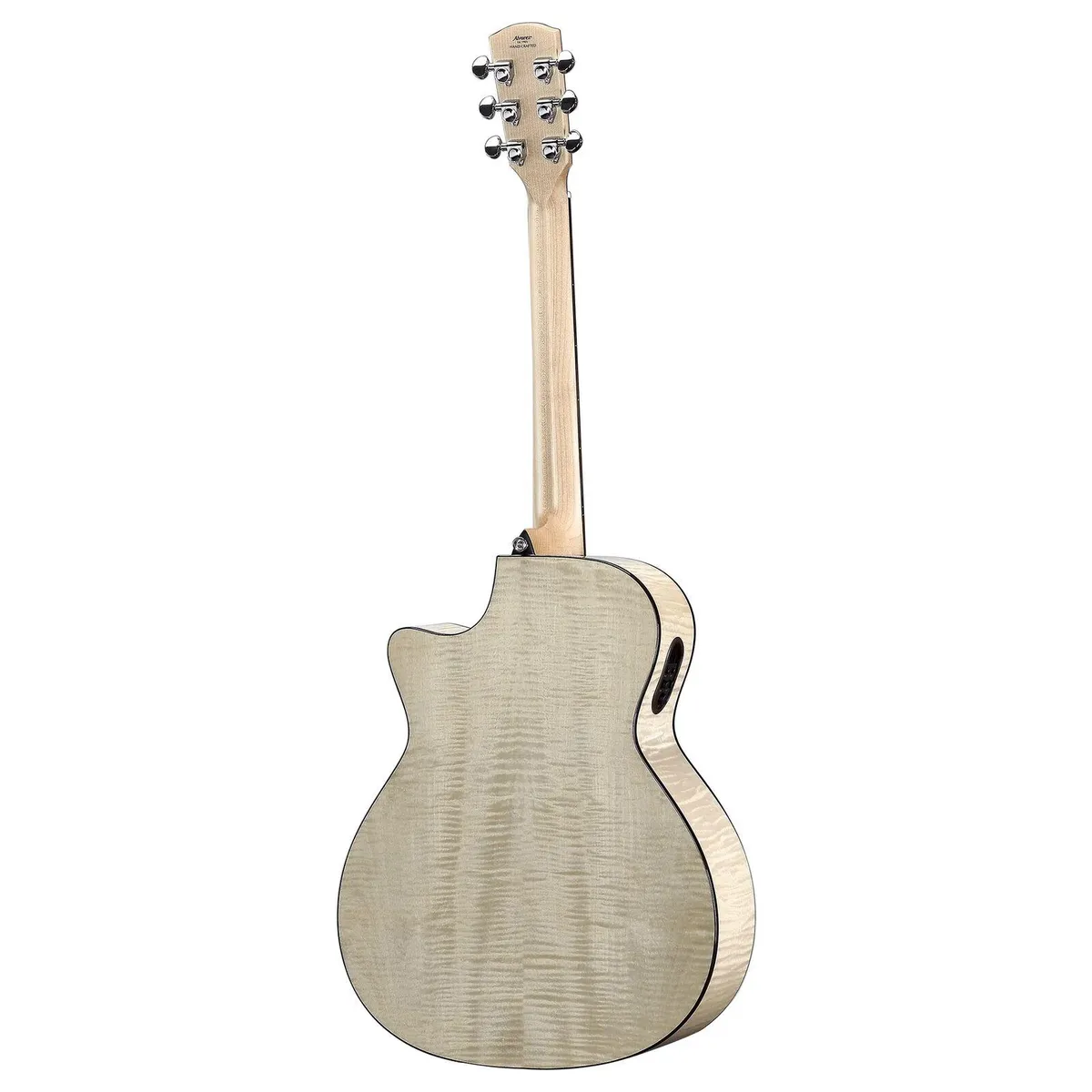 The AEG80ce is a beautifully developed Grand Auditorium that delivers in both tone and looks. The minimal styling of this guitar creates a classy vibe with the light blonde of the spruce and maple framed with Ebony. Tonally, this guitar has a robust voice with shimmering trebles, plenty of low-end and an instant response. It also offers added functionality and comfort with its cutaway and slim style bevel armrest, making the AEG80ce a great-looking, versatile instrument.