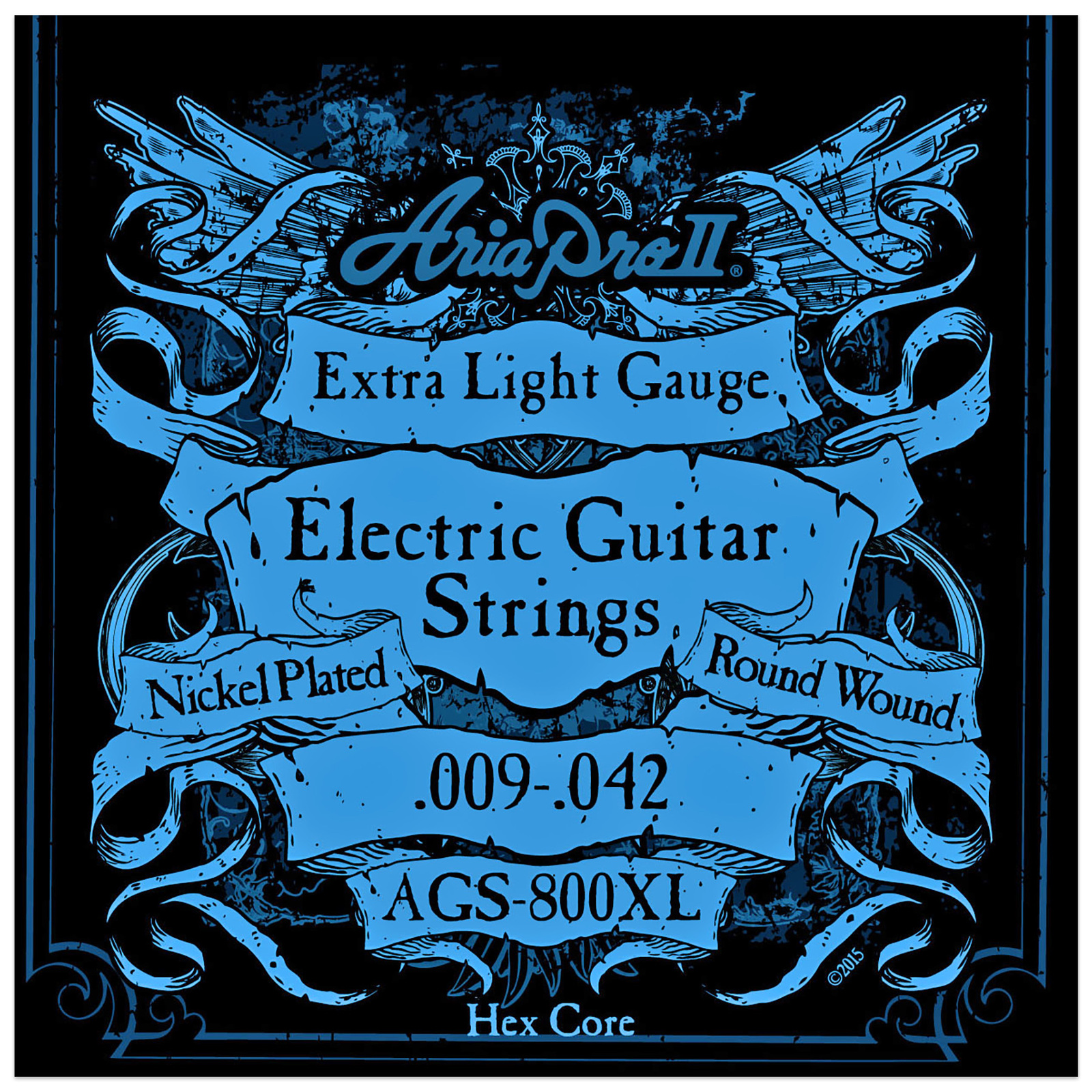 Aria Pro II electric guitar strings are made from nickel plated steel wire wrapped around a hexagonal core.