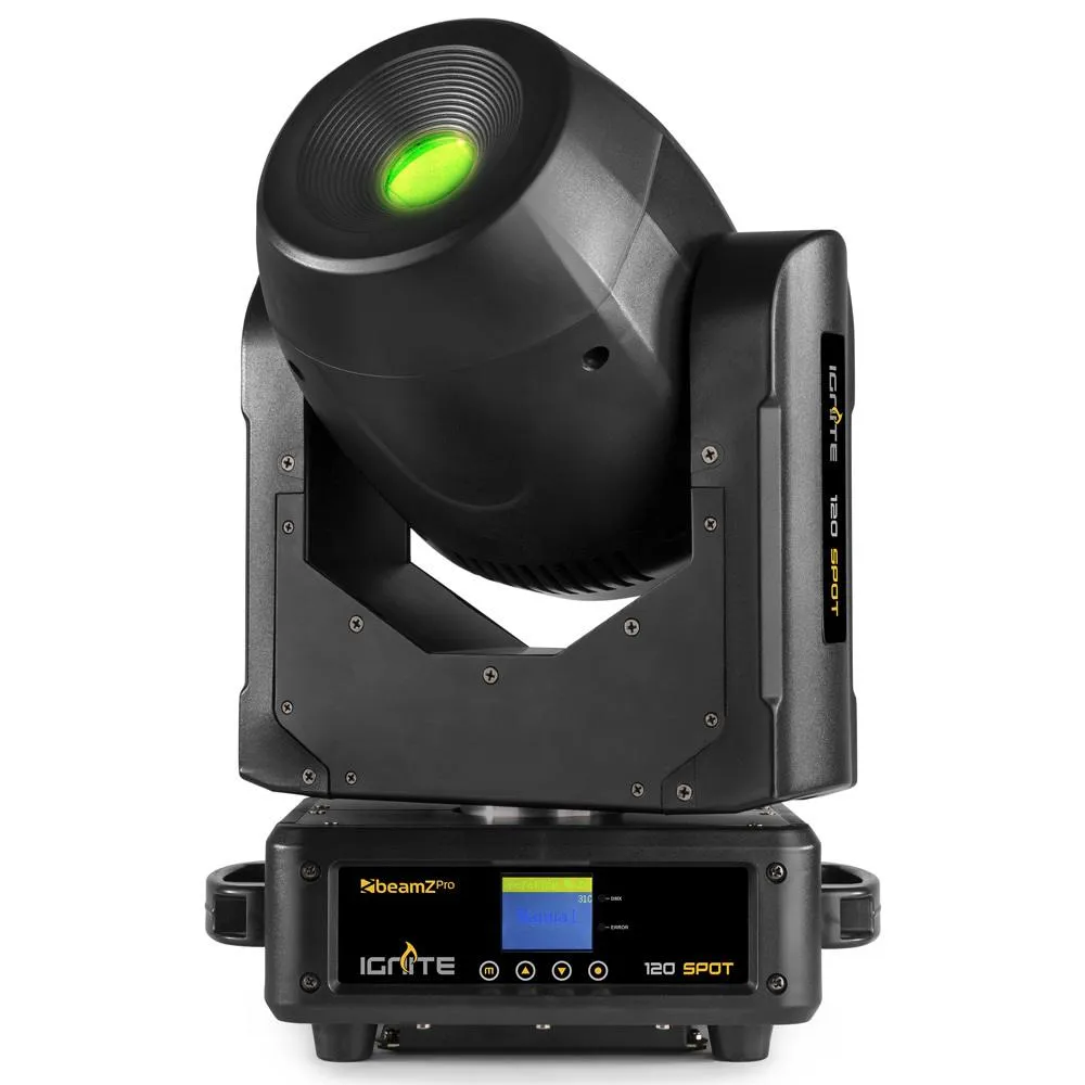 The IGNITE120 is a powerful LED moving head with a 120W bright white LED source. Equipped with 2 gobo wheels and a rotating 3-facet prism to make stunning aerial effects in 8 colours. The 12 degrees beam angle make this the ideal fixture to use for gobo projection and sharp beam figures. The Ignite120 is capable of DMX control in 2 different channel modes, master/slave or stand-alone operation. It includes different show pre-sets, strobe and dimmer functions and a built-in microphone for sound activation.