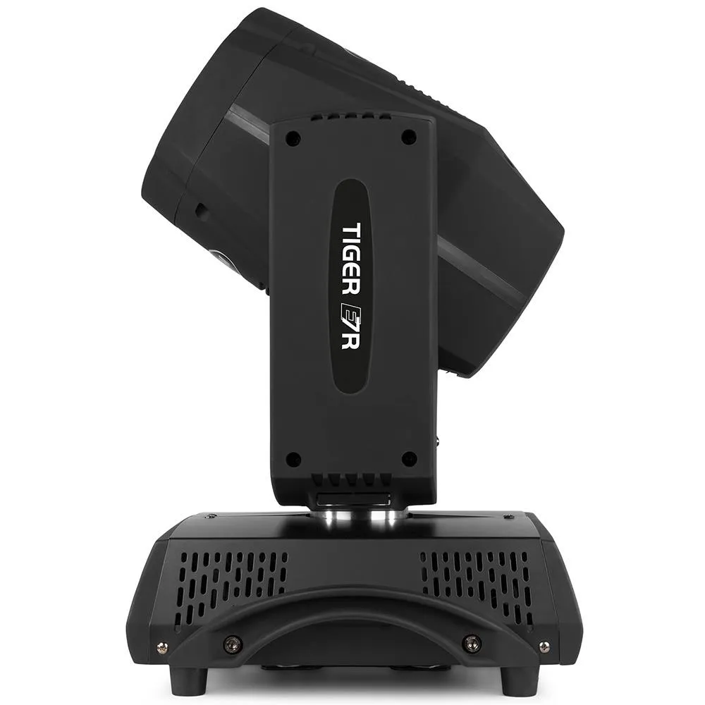 This Tiger 7R moving head has a very bright output due to the use of the 7R 230W high intensity discharge bulb. The moving head is equipped with a colour, frost, gobo and prism effect wheel for ultimate control. The gobo wheel has 17 different gobos + open, together with the motorized 16-facet rotating prism it can create a wide range of light effects. The colour wheel has 14 colours + open. This Tiger 7R moving head works both in DMX or stand-alone mode. When operating in DMX mode you have complete control with 16 DMX channels. Among its features are an mechanical shutter and adjustable speed strobe, frost lens, rotation prism, motorized focus and mechanical dimmer.