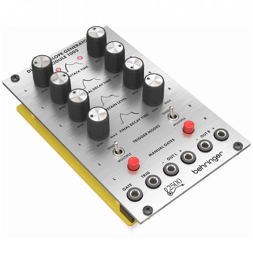 An authentic re-creation of the dual envelope generator found on a legendary synth maker’s inaugural modular system, the Behringer 1003 Dual Envelope Generator offers a period-correct all-analog signal path for superior soundshaping. The 1003’s familiar four-section design includes attack time, initial decay time, sustain level, and final decay time – or release, in modern parlance. Yet, unlike the original, the 1003, along with all Behringer 2500 series modules, ditches the convoluted patch matrix for Eurorack patch points, allowing for more intuitive patch cable routing. The module features six patch points: gate and trigger inputs and four signal outputs, including two inverted outputs for added flexibility. Use the Behringer 1003 for crafting long amplitude or filter swells, snappy percussive hits, or impactful stabs, or use it to modulate pulse width, pitch, or numerous other parameters for advanced patch creation. With this well-priced Eurorack module, it’s easy and affordable to recreate one of the finest modular systems of all time, or integrate it along with any Eurorack devices for constructing an epic rig that combines vintage-style components with cutting-edge technology.