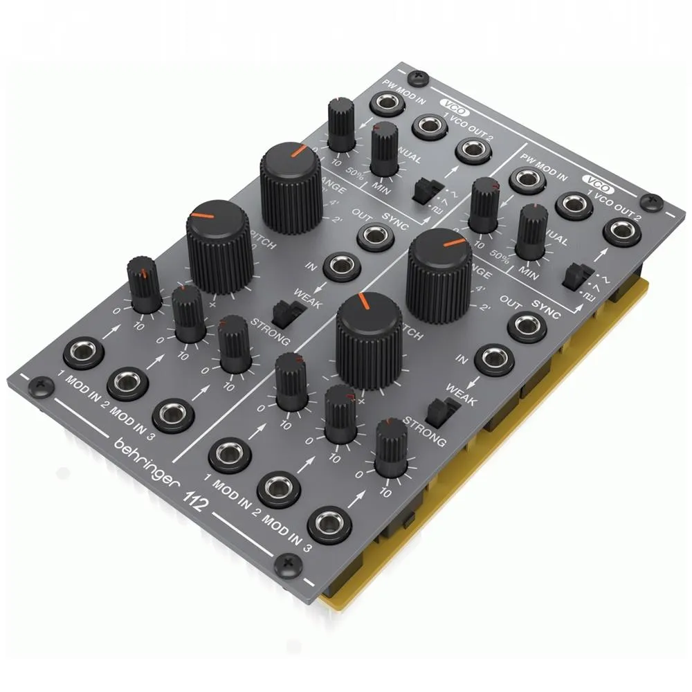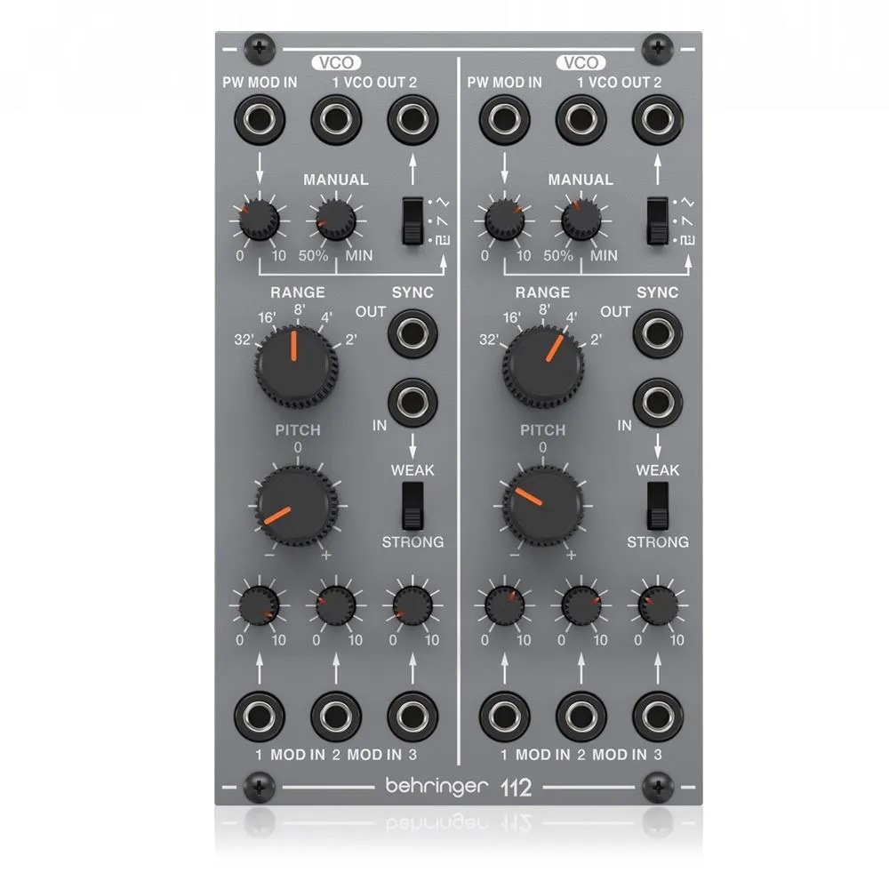 Based on a legendary modular synthesizer system popularized in the 1980s by artists such as Depeche Mode, Tears for Fears, and The Human League, the Behringer System 100 Eurorack modules serve up the neon-tinged synth sounds that were the soundtrack to a decade of decadence. The Behringer 112 Dual analog VCO Eurorack module is an authentic reproduction of one of the original units, featuring two independent oscillators housed in a single 16HP device. Each of the Behringer 112’s two VCOs features three selectable waveforms — triangle, sawtooth, and square, with pitch and range controls. Pulse width modulation can be adjusted manually or via CV, and the Behringer 112 includes three mod inputs per VCO for modulating pitch. Additionally, the Behringer 112 is equipped with oscillator sync in and out, with strong or weak sync modes for altering the waveshapes to create unique tones and timbres. These well-priced modules are an ideal starting point for the Eurorack curious, and Eurorack experts will be blown away by their stellar vintage-inspired sound!