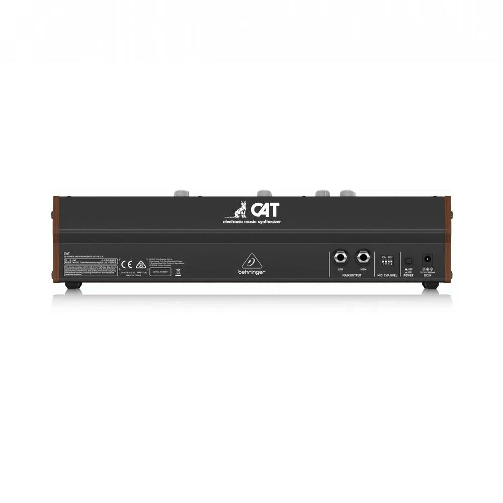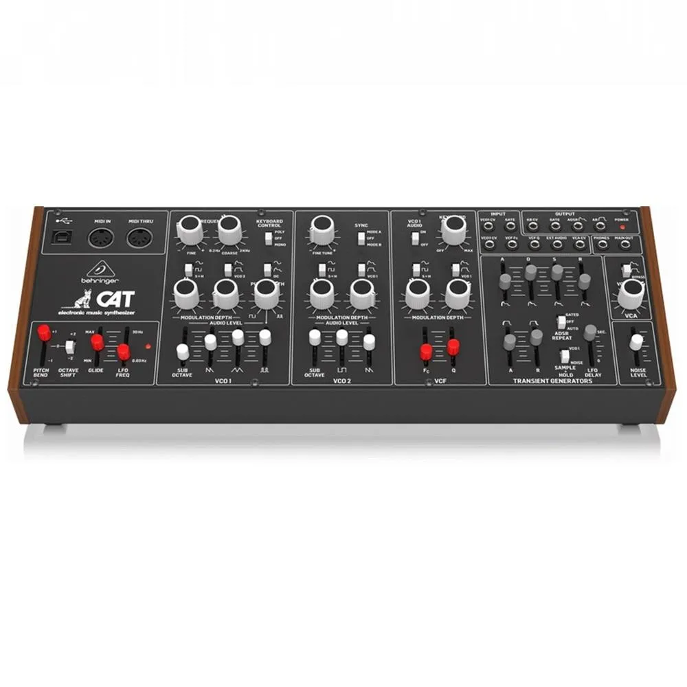 Based on a cult synth classic that prowled onto the scene in the mid-1970s, the Behringer CAT duophonic analog synthesizer has a foreboding growl and a fierce bite owing to its dual-VCO design, four mixable waveforms, and gritty white noise generator. With a sleek interface befitting its name, the CAT takes a straightforward approach to synthesis with a few surprising twists to produce some seriously aggressive synth tones. The CAT’s two analog VCO’s can be independently controlled for laying down fat basslines under sinewy leads in real time or stacked in unison. The CAT lets you blend four variable oscillator shapes — sawtooth, triangle, modulated pulse, and sub-octave square — to produce uber-dense synth tones, which can be further manipulated from six different modulation sources, and a dedicated true-analog sine/squarewave LFO. A self-oscillating-resonant filter and transient generator sharpen the CAT’s fangs by allowing detailed control over its harmonic behavior and envelope generation.