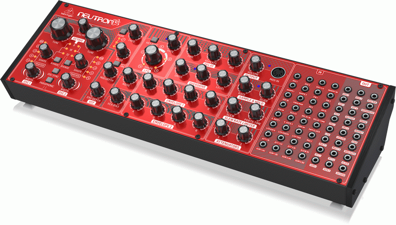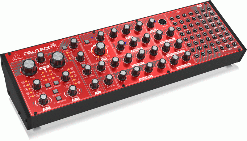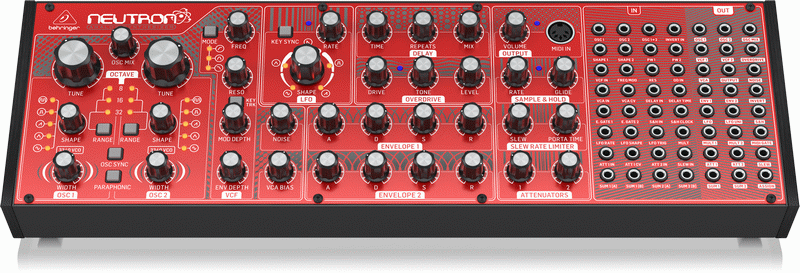 What's red, has two oscillators and 56 patch points, and gobs of attitude? The Behringer Neutron semi-modular analog synth offers seemingly no end to the delightful sonic mischief you can patch your way into. With a duo of punchy morphable-waveform oscillators and generous modulation options, this standalone/Eurorack duophonic synthesizer delivers searing leads that'll strip the paint off club walls, and massive basses that will blow them down. From mesmerizing celestial pads to blippy extraterrestrials, Neutron has you covered. For sonic expression, CV (control voltage) is where it's at, and the Neutron offers full access. With its sizable patchbay, you can forge your own completely unique signature sounds and set yourself apart from the pack — even if the pack is geared up with Neutrons!