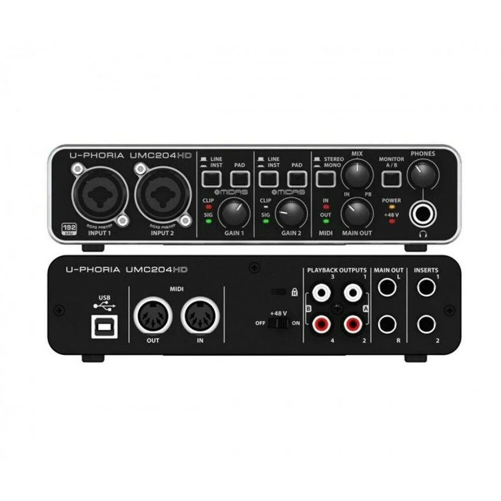 One of the things that really makes the Behringer U-Phoria UMC204HD USB 2.0 audio interface stand out is its genuine MIDAS preamplifier technology. Known throughout the world of live sound for delivering ultra clear sound with plenty of headroom, MIDAS preamps are among the most popular mic pres on Earth. What's more, these preamps come standard with +48V phantom power onboard, so you can use your choice of quality condenser microphones with your U-Phoria UMC204HD.