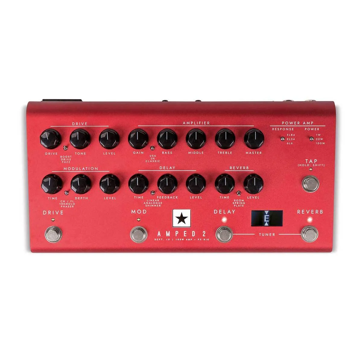 AMPED 2 is a 100 Watt pedal power amplifier with drive pedals in the front end, and an advanced effects processor capable of delivering the tone and feel of a traditional valve amp. It can be used to power a cabinet, go direct or connect to the front end of a traditional amp, ensuring you can take your sound with you anywhere. Power reduction down to 1W and USB-C connectivity means it’s equally at home in the studio or stage.