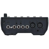 - Independent faders and mute buttons for the five audio input channels and master output