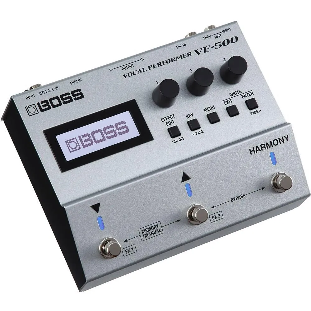Packing professional sound quality and serious BOSS DSP muscle, the VE-500 delivers sophisticated harmony and pitch correction functions that automatically track the chords you play on your guitar. It also includes a powerful vocoder and core sound-enhancement tools, plus world-class reverb, delay, and modulation sounds and specialty effects like distortion, filtering, and many others. And with programmable memories, you can instantly recall favorite setups for any song or style. The VE-500 is the perfect addition to the pedalboard of any singing guitarist, providing top-flight vocal processing that fits right alongside your standard guitar effects.