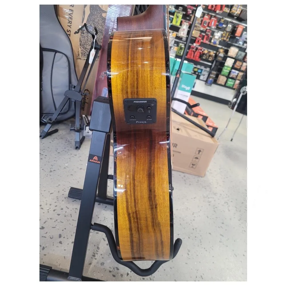 Go Exotic, sustainably! Breedlove has long specialized in offering intriguing alternative tonewoods, introducing, for example, hauntingly figured Oregon myrtlewood to the guitar world 25 years ago. The Pursuit Exotic S Series—featuring TUSQ nuts and saddles and Breedlove’s earth-conscious, sonically superior EcoTonewood technology—allows you to affordably experience the pure, nuanced sound and striking visual beauty of exotically alluring myrtlewood, koa and cedar. All four of Breedlove’s revolutionary body shapes are available in a popular all myrtle configuration, with a stunning gloss Tiger’s Eye finish. Specialty instruments like nylon string, 12-string and fretted/fretless bass models are available in elegant Natural and Amber tones. Side-mounted Fishman Presys I electronics (with built-in tuner, volume, contour and phase controls) make amplification a breeze.