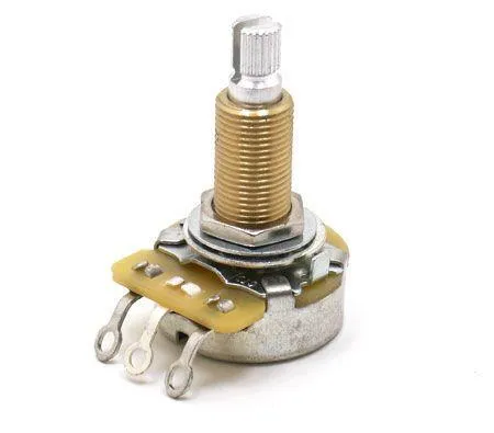 25K Audio Taper, Split Shaft With Nut, Lock & Dress Washer. 3/4' (19mm) threaded shaft length for guitars with thick tops. US thread and 24 spline.