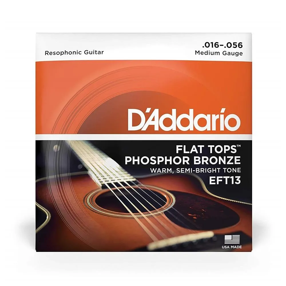 D'Addario's EFT13 Flat Top PB Resophonic Acoustic Stringsare phosphor bronze strings polished smooth. This produces a smooth,flattened playing surface, but does not sacrifice the warm tone andsustain associated with phosphor bronze strings. Flat Tops areexcellent for recording and greatly reduce finger noise.