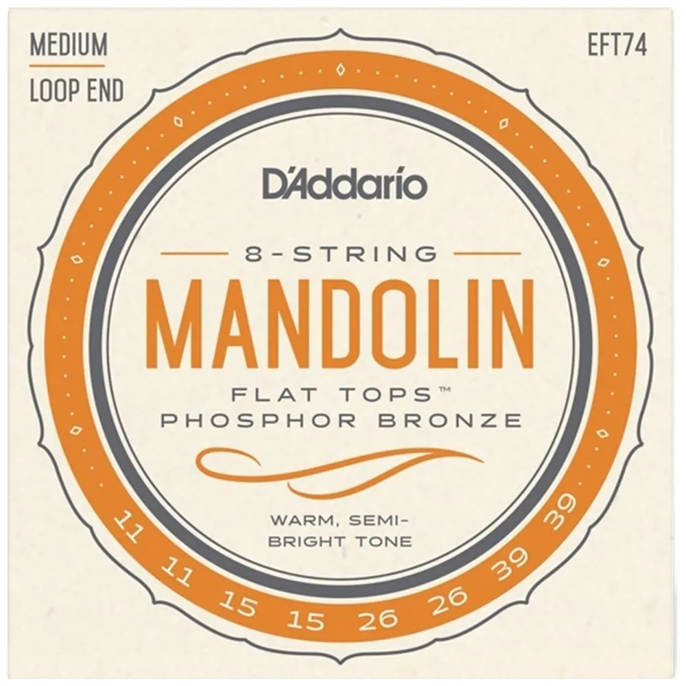 D'Addario EFT74 Flat Topmandolin strings are round wound, then precision ground, leaving theouter surface smooth and "semi-flat." This produces a smooth, flattenedplaying surface, but does not sacrifice the warm tone and sustainassociated with phosphor bronze strings. Flat Tops are excellent forrecording and greatly reduce finger noise.