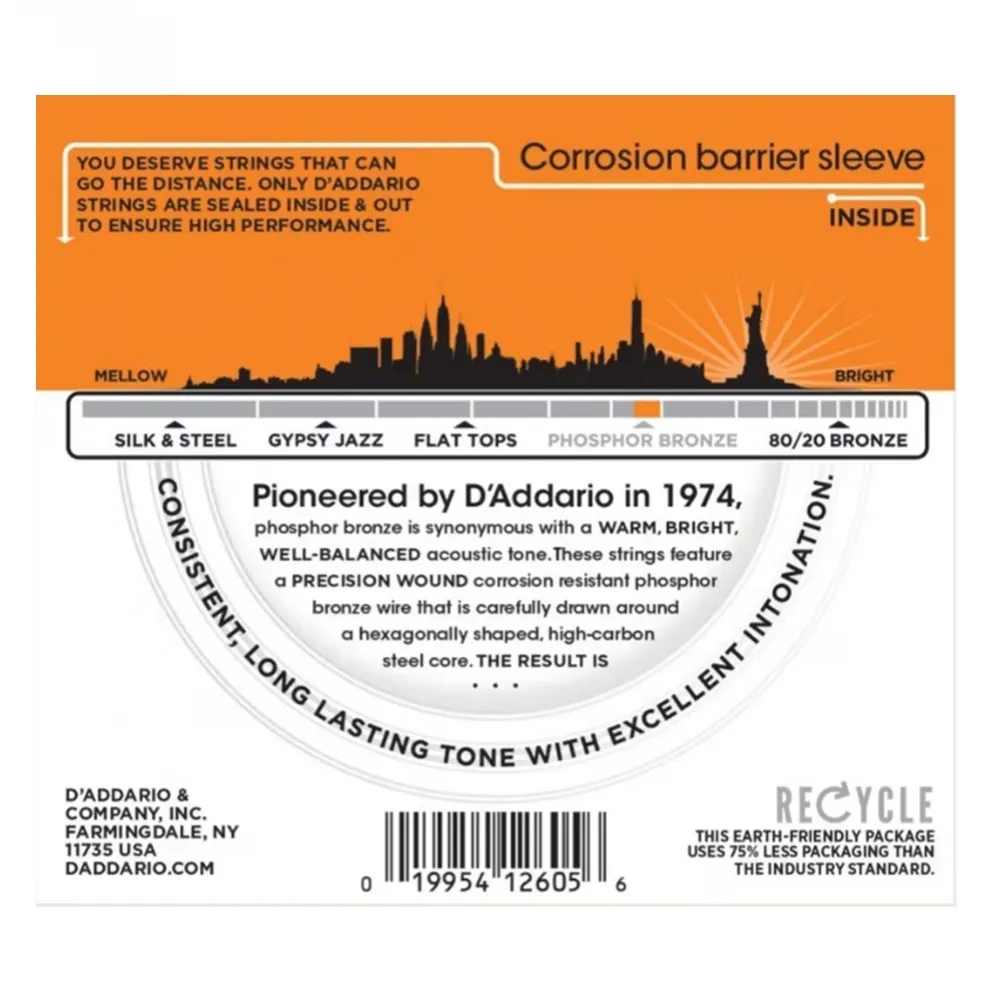 The D’Addario EJ15 Phosphor Bronze Acoustic Guitar Strings are an extra-light gauge set built for players who want a bright, balanced acoustic tone with minimal string tension.