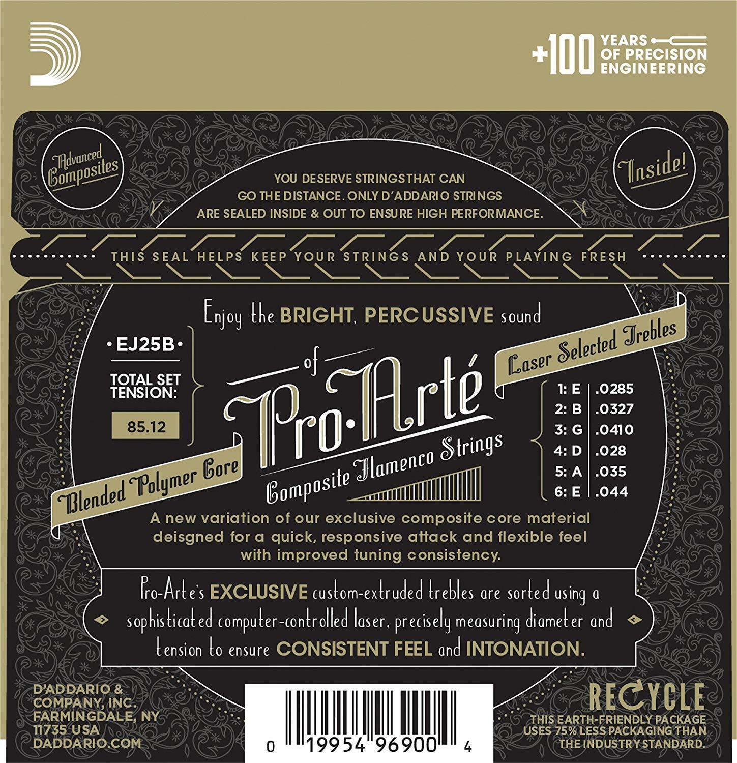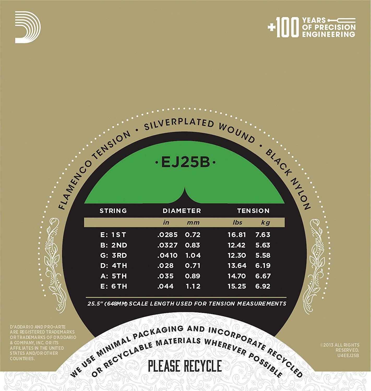 EJ25B Flamenco sets are constructed using a new variation ofour exclusive multifilament stranded core material that dramaticallyimproves the life and tuning consistency of the wound strings whencompared to traditional nylon cores. Complimented by black nylontrebles, this set was created and tested with artists worldwide todeliver a flexible feel while still maintaining a quick attack responsethat is essential for flamenco players. This Flamenco set is alsoavailable in a clear nylon version (EJ25C), providing tone andappearance options for both traditional and progressive players.
