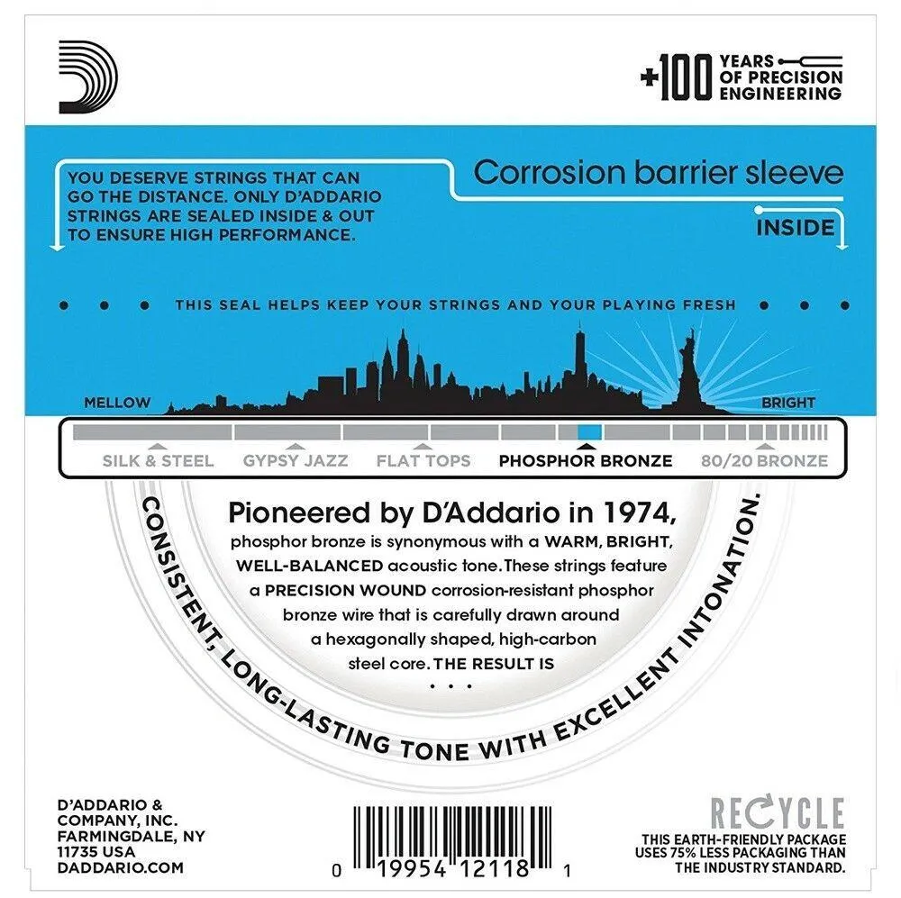 D'Addario EJ38 12-String Light Acoustic Guitar Strings employ a genuine phosphor bronze alloy that retains flexibility as well as brilliant tone for many hours of hard play. Computer-controlled wrapping around a hex core ensures consistency and extends life. Many top guitarists won't play any brand other than D'Addario.Regardless of your playing style, D'Addario has a set of strings that's right for you.