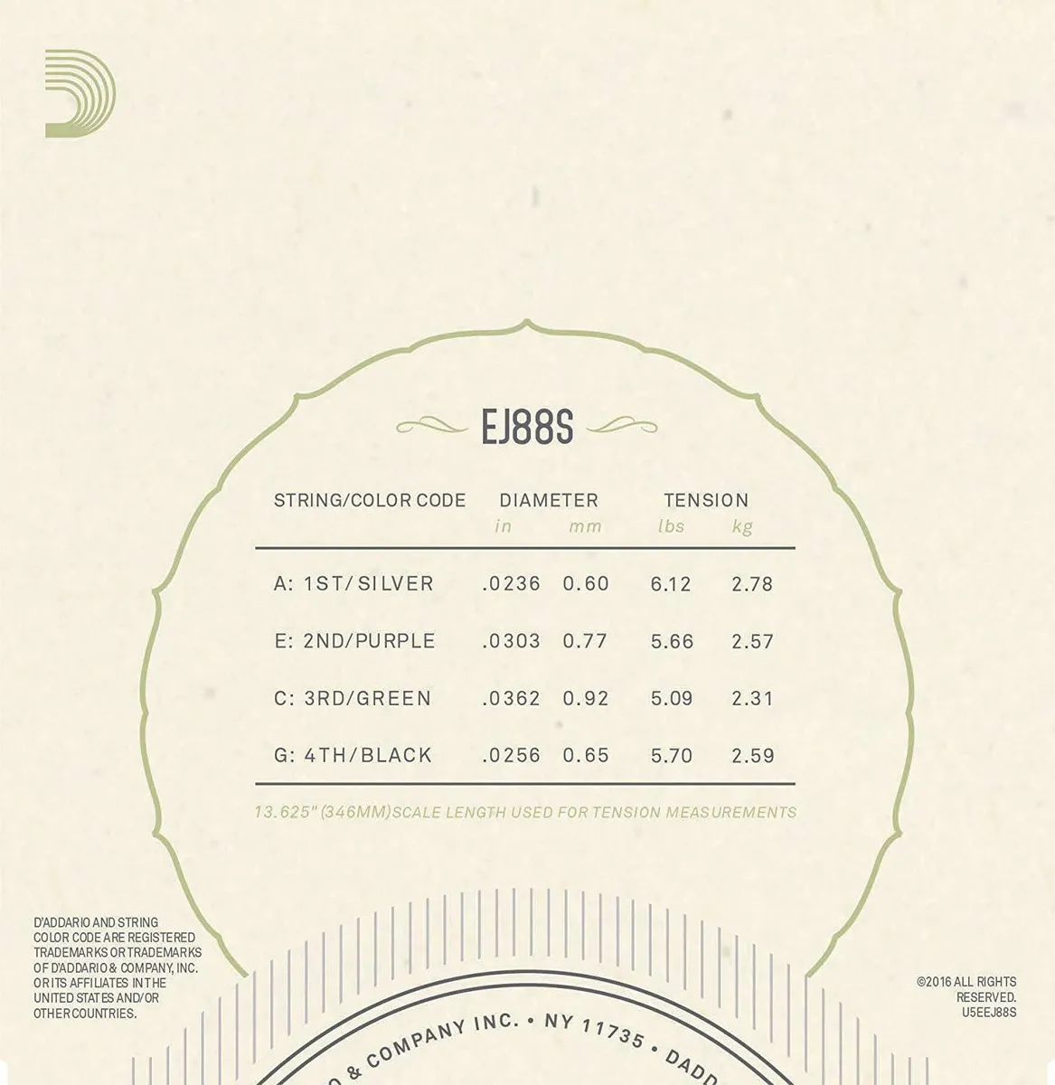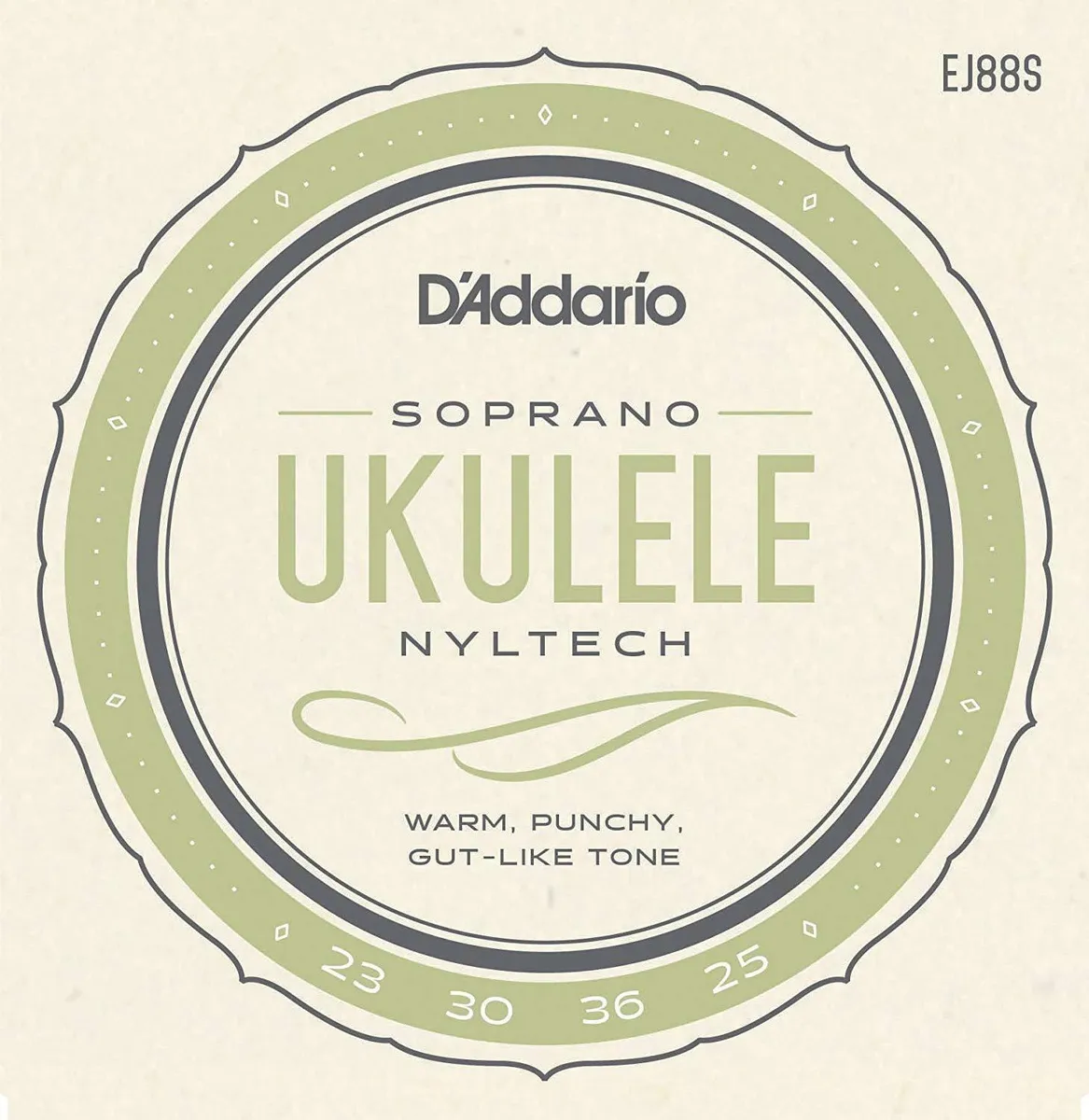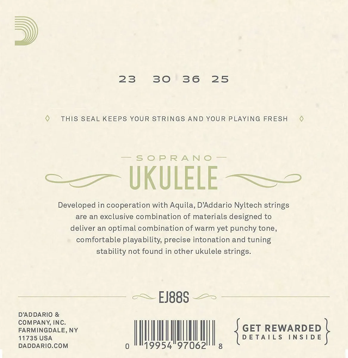 D'Addario EJ88S sets are designed for use with all soprano ukuleles. Each string within this set is made from our exclusive Nyltech material and optimized for GCEA tuning.Developed in cooperation with Aquila, D'Addario Nyltech strings are an exclusive combination of materials designed to deliver an optimal combination of warm, yet punchy tone, comfortable playability, precise intonation and tuning stability not found in other ukulele strings. D'Addario, the world's largest manufacturer of musical instrument strings, is known as The Players Choice with a reputation for unsurpassed quality and consistency. D'Addario's innovative packaging reduces waste and provides protection from corrosion. All D'Addario strings are manufactured in the U.S.A. using proprietary, digitally controlled, state-of-the-art machinery for unmatched performance, set after set.