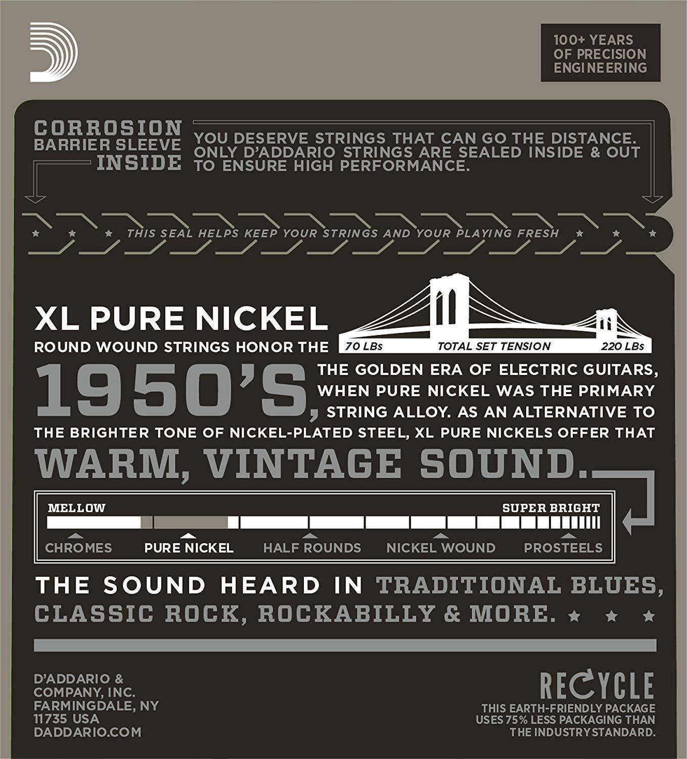 D'addario xl pure nickel strings look back to the '50s, when nickel was the primary alloy found in electric guitar strings. into the '60s, these pure nickel strings would be supplanted when guitarists required brighter tone and enhanced magnetic properties/characteristic of the d'addario xl nickelplated steel string line, pure nickel delivers classic, warmer timbres that define many genres including blues, classic rock, rockabilly, and more.