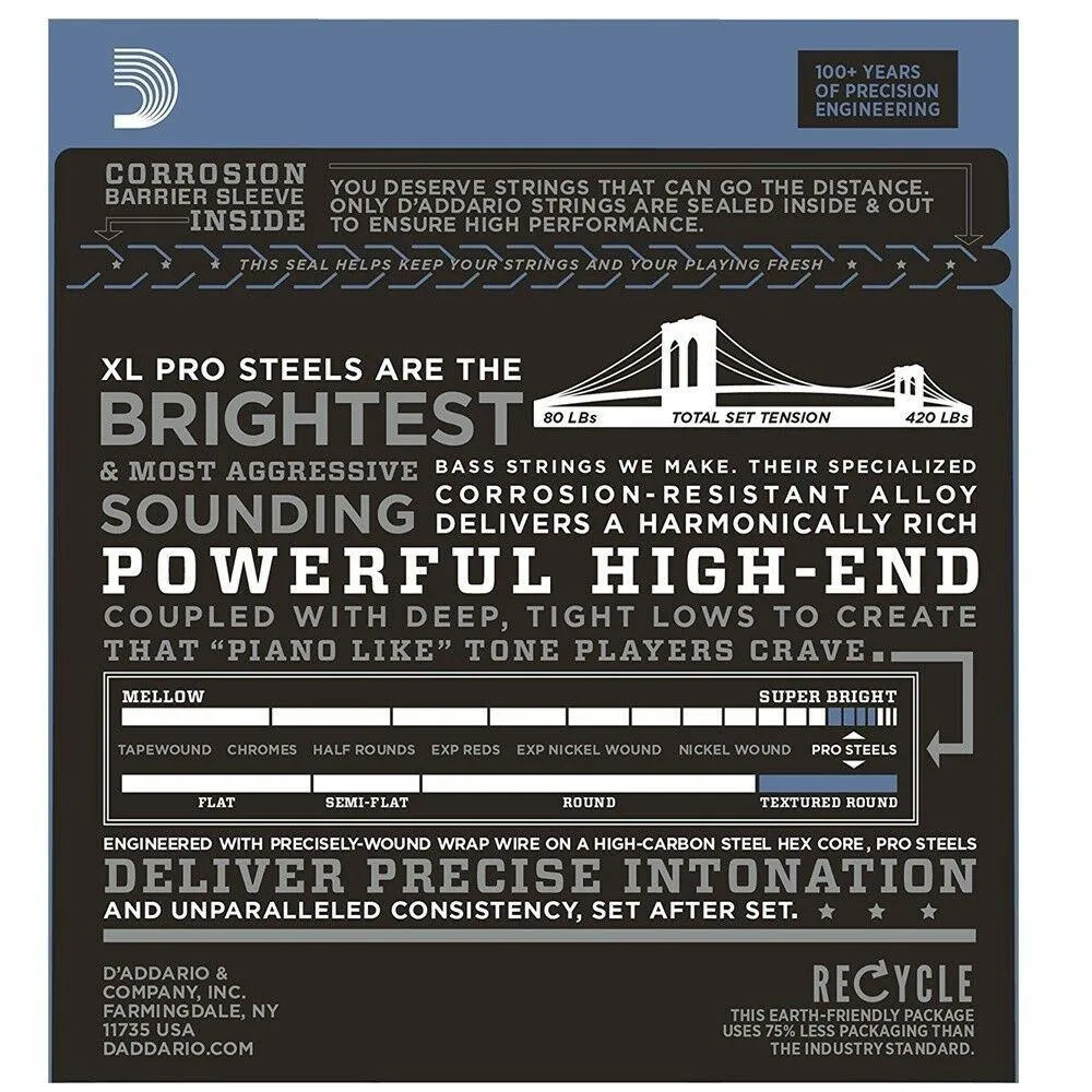 ProSteels are one of D'Addario's brightest and most corrosion resistantstrings. A specialized steel alloy delivers harmonically rich,brilliant high-end coupled with deep, tight lows that work in tandem tocreate the coveted "Piano tone" steel players crave. Great for botharticulate fingering or aggressive picking, ProSteels give you theextra edge and punch you need to cut through the mix.