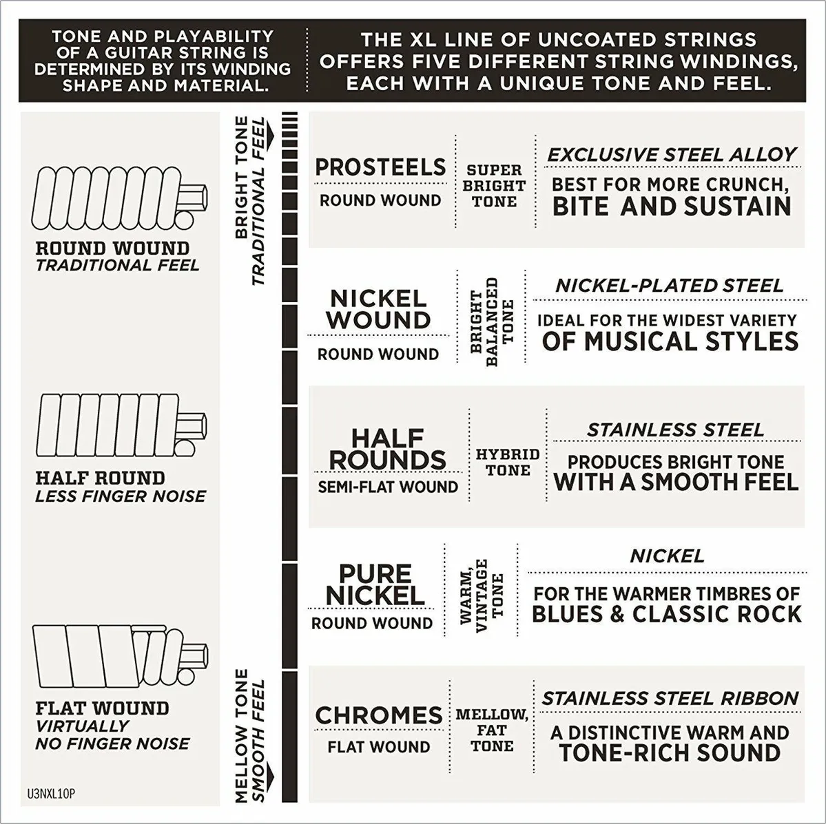 XL strings provide a classic uncoated feel and bright tone, NYXL focuses on enhanced tuning stability and durability, and XS strings add extended life through an ultra-thin coating.