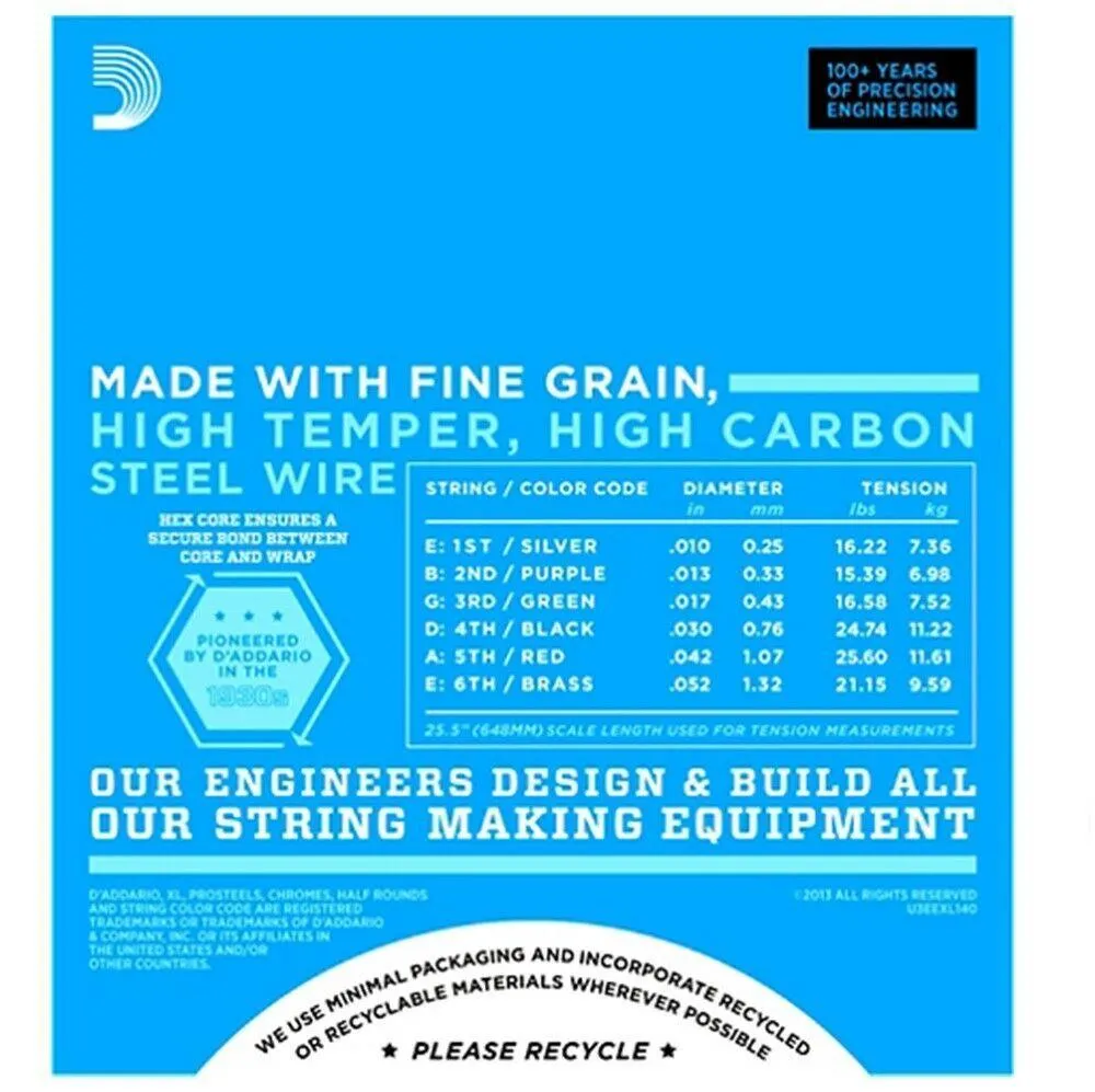 D’Addario EXL140 electric guitar strings feature a light top and heavy bottom gauge, giving players a balanced feel with a tight, controlled low end. This popular 10–52 set is ideal for drop tunings, heavy rhythm playing, and modern rock and metal styles.