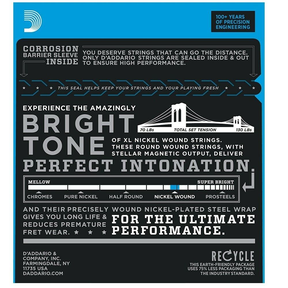 D'Adarrio's XL Nickel Wound electric guitar strings, theirmost popular string, gives your guitar a bright and detailed sound withspot-on intonation. We know that choosing the perfect string is vitalto a musician's sound. The hexagonal high carbon steel core is wrappedwith nickel-plated steel for a long-lasting string that's ready totackle any style of music.
