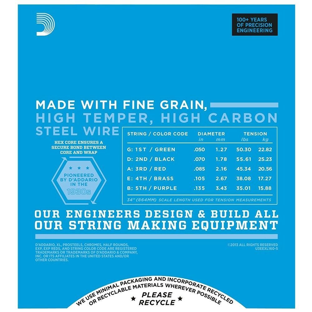 Gauges 50-70-85-105-135.D'Addario EXL160-5 bass strings employ genuine phosphor bronze alloy that retains flexibility as well as brilliant tone for many hours of hard play.Computer-controlled wrapping around a hex core ensures consistency and extends string life.D'Addario is the world's largest manufacturer of strings for musical instruments. Many top guitarists won't play any other brand. Regardless of your playing style, D'Addario has a set of strings that's right for your 5-string bass.