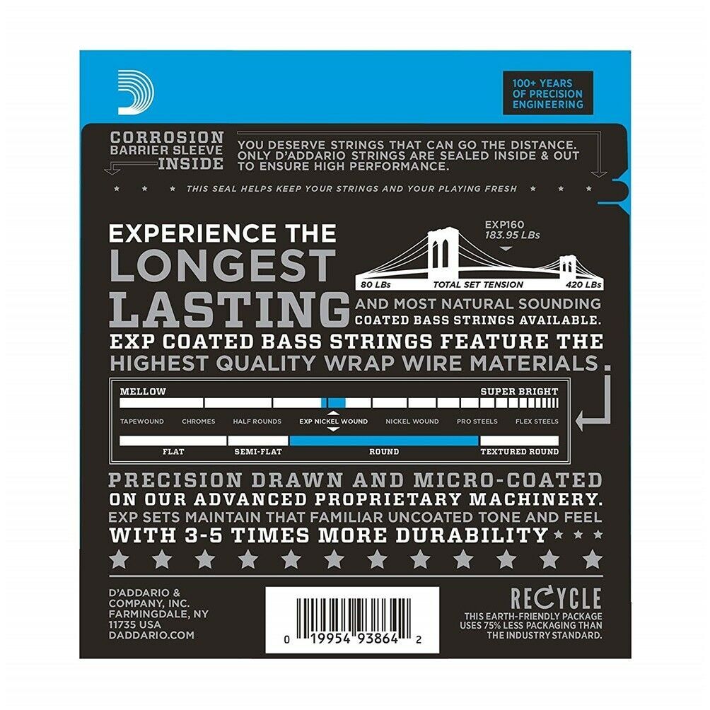EXP160 delivers all the tone and performance of our popular EXL160 bass set, offering the ideal combination of bright, booming tone and light, comfortable feel with 4 times more string life. Fits long scale basses with a string scale length of up to 36 1/4 inches.