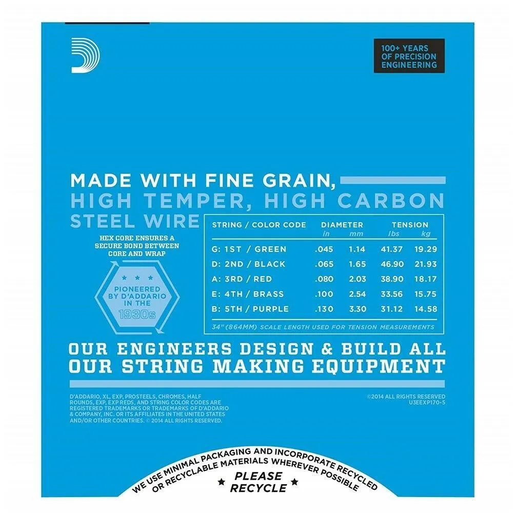 Extended life and brilliant tone. Gauges - .045 .065 .080 .100 .130. EXP170-S 5-string bass strings provide longer life and increased durability coupled with the brightness, clarity and sensitivity you've come to expect from D'Addario strings. Here is how they work: An ultra-fine layer of EXP coating is bonded to the phosphor bronze wrap wire which is then wound onto the hex-shaped core wire. The result is a built-in barrier against the corrosion and wear that can quickly sap the life out of your strings and your sound. And since the EXP coating is cross-linked to the wrap wire prior to winding, the strings sound fresh and bright. New-string tone lasts 3 to 4 times longer than traditional strings. D'Addario is the world's largest manufacturer of strings for musical instruments. Many top guitarists won't play any other brand. Regardless of your playing style, D'Addario has a set that's right for you.