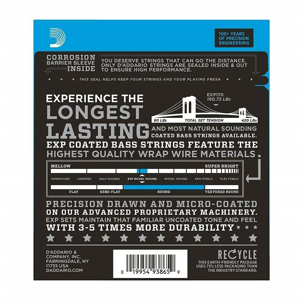 EXP170 delivers all the tone and performance of our best-selling EXL170 bass set, offering the ideal combination of bright, booming tone and comfortable feel with 4 times more string life. Fits long scale basses with a string scale length of up to 36 1/4 inches.