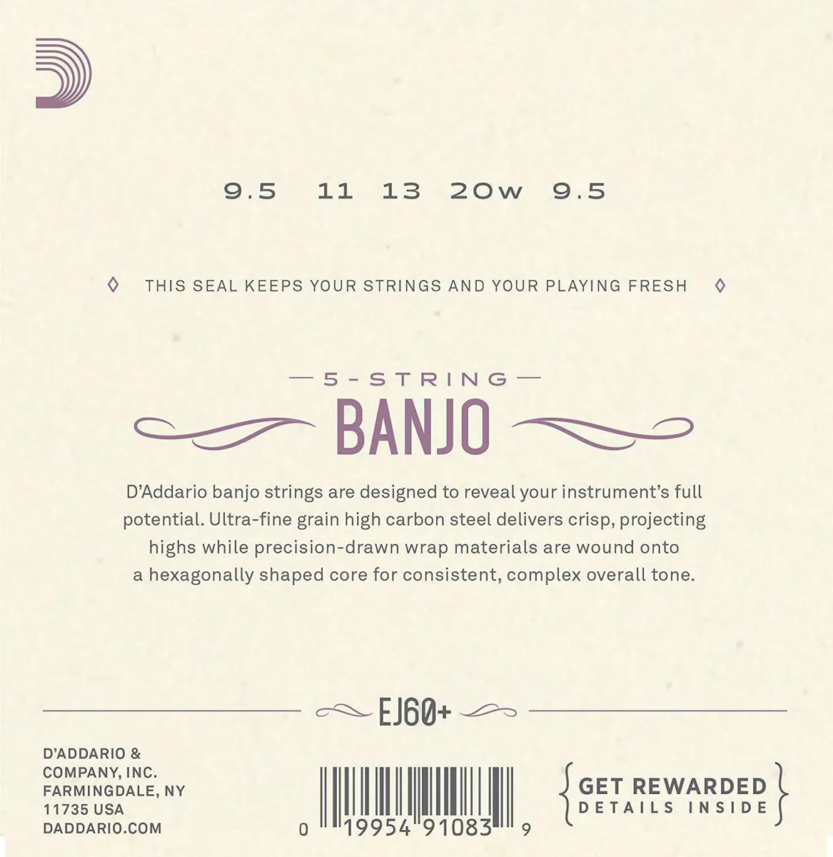 - Plus gauge plain steels for customized tension/feel^Loop end construction for universal fit^Nickel-plated steel for bright tone, smooth feel and long life^Made in the U.S.A. for the highest quality and performance^String Gauges: Plain Steel .0095, .011, .013, Nickel Wound .020, Plain Steel .0095