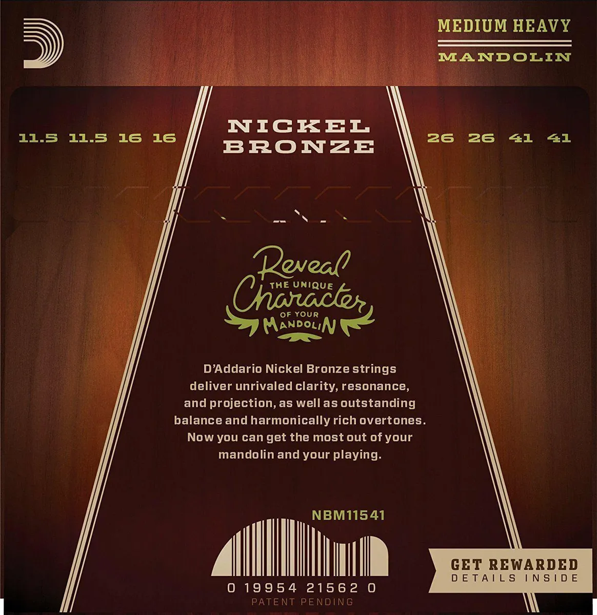 D'Addario's heaviest premium uncoated mandolin string set thatprovides a crisp and clear sound to accentuate the unique tone of yourmandolin. NBM11541 delivers the increased tension for maxium volume.Loopend construction for universal fit.