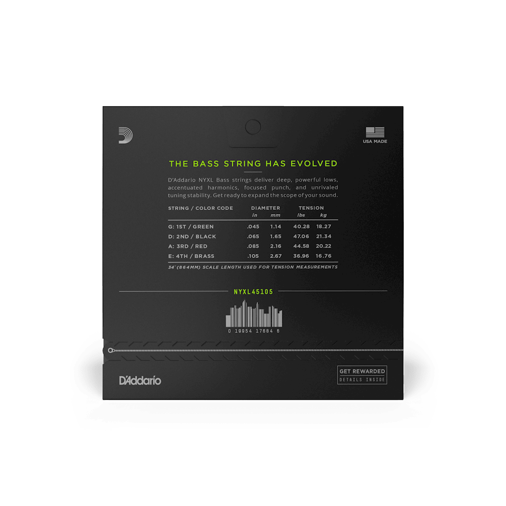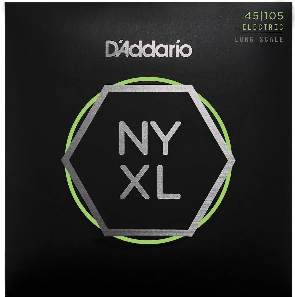 D’Addario has rebuilt the electric bass string to bring more sonicpossibilities to bass players. NYXL Bass combines our high carbon NYSteel core and up to three wraps of our reformulated nickel-platedsteel in new core-to-wrap ratios. This advanced construction providesmore dynamic range and sustain than any other bass string. Meticulouslydesigned for all playing styles, this string features deep, powerfullows with focused punch, increased dynamics, and accentuated harmonicresponse.