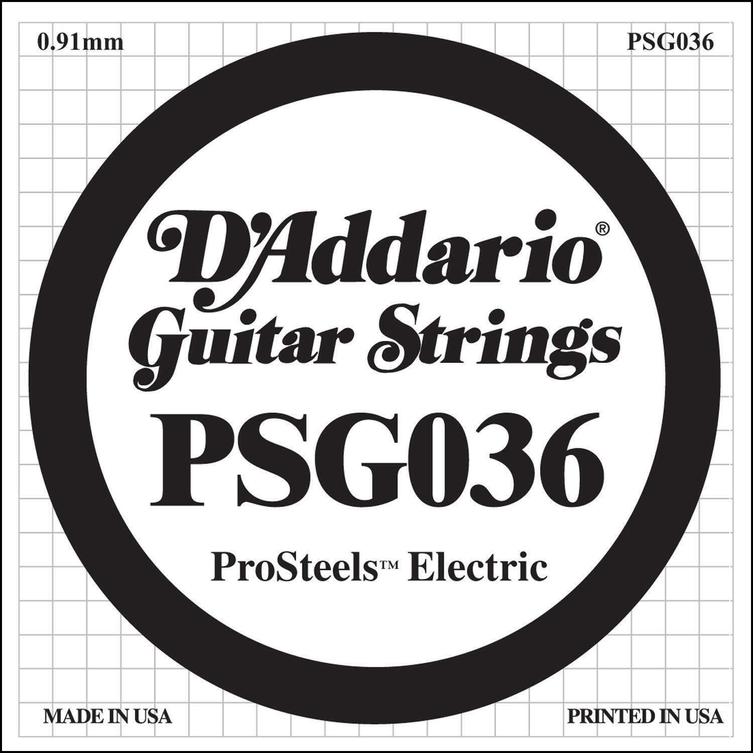 PSG036 is a .036 gauge ProSteels electric guitar string. Perfect as a replacement string or for creating custom sets. Part of the D'Addario ProSteels string series. D'Addario XL ProSteels utilize a highly magnetic, corrosion-resistant steel alloy that delivers super-bright tone without shrill overtones. They offer a palette of harmonically rich, brilliantly penetrating highs combined with pronounced, tight-and-tough lows. If you're looking for more crunch, bite, and sustain, ProSteels are the choice for you.D'Addario, the world's largest manufacturer of musical instrument strings, is known as The Players Choice with a reputation for unsurpassed quality and consistency. All D'Addario strings are manufactured in the U.S.A. using proprietary, digitally controlled, state-of-the-art machinery for unmatched performance, set after set.