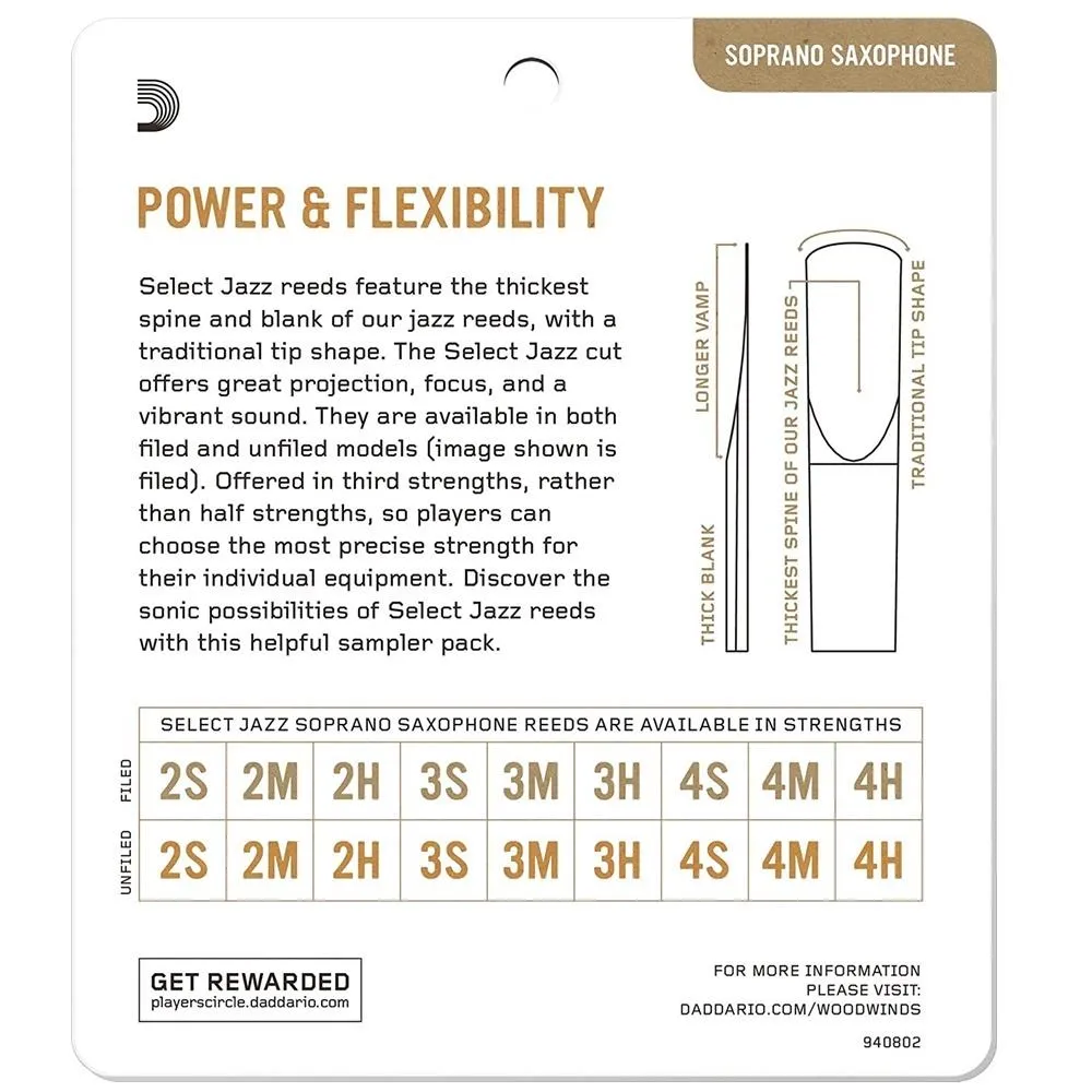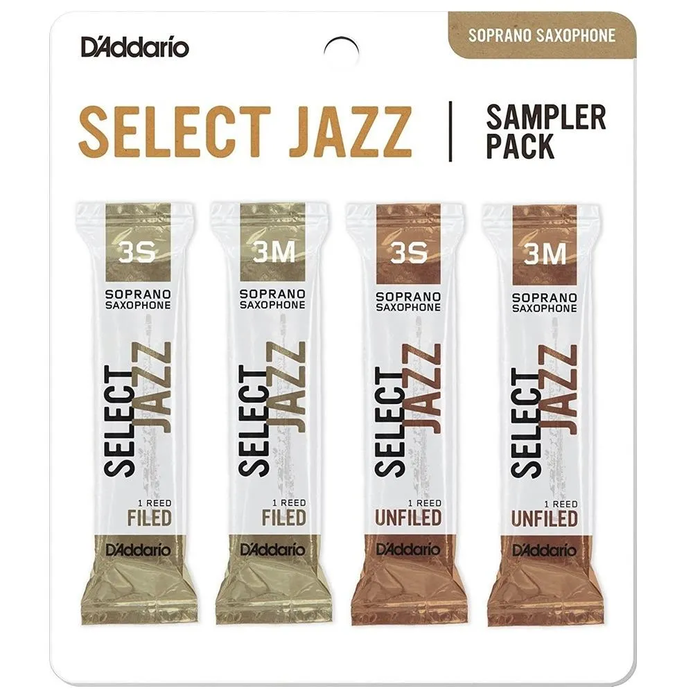 Select jazz reed sampler packs allow the player to experiment with various reed cuts and Strengths before committing to a full box. Each saxophone sampler pack contains two select jazz reed Strengths in both filed and unfiled cuts for a total of four reeds per card. Every reed is individually sealed. Select jazz reed sampler packs allow the player to experiment with various reed cuts and Strengths before committing to a full box. Each saxophone sampler pack contains two select jazz reed Strengths in both filed and unfiled cuts for a total of four reeds per card. Every reed is individually sealed.