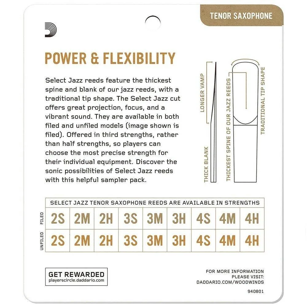 The D'Addario Select Jazz Tenor Sax Reed Sampler Pack features four slightly different variations for musicians to find their preference. The reeds have a strength rating of 2 which is ideal for an expressive response. The reeds have medium and hard levels for suiting different musicians' preferences. The Jazz reeds are renowned for their focus and vibrancy, as well as producing a loud sound. The Jazz sample pack is ideal for musicians who want to find the exact reed that's appropriate for their performance.
