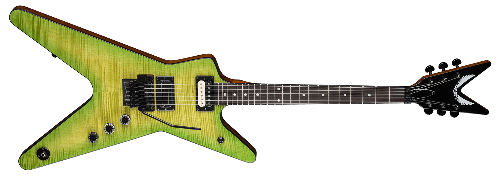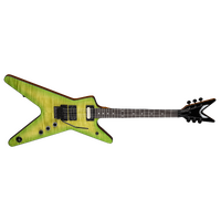 The Dean Dimebag Dime Slime ML has a gorgeous top and comes in a special Dime Slime finish. It's armed with a versatile and powerful combination of DMT Design and Seymour Duncan SH13 Dimebucker pickups. A Floyd Rose Special tremolo bridge with locking nut is onboard to cover any tremolo or dive-bombing effects you care to make. The neck has a comfortable V profile along with a rosewood fretboard and abalone dot inlays.