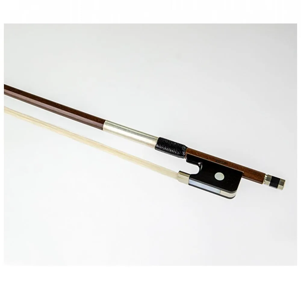 An excellent trio of materials combine beautifully to make these bows and exceptional experience. Massaranduba brazilwood for the stick, genuine ebony from tropical Africa for the frog and finest mother of pearl or iris for the eyes and slides. As Massaranduba is very heavy and hard, these bows lie particularly well in the hand of the musician. The dark black, very dense heart wood of the frog lends the play with these bows a pronounced harmonic tone.