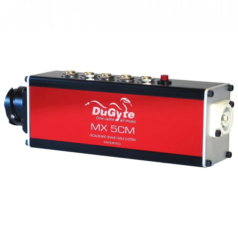 The DuGyte MX 5CM is the first single cable, AC powered Pedalboard Connection System developed for use with pedal boards like Helix, Fractal and Boss, to name a few or AC Mains connected DC isolated power supplies like the Voodoo Labs, Viper, Zuma etc.