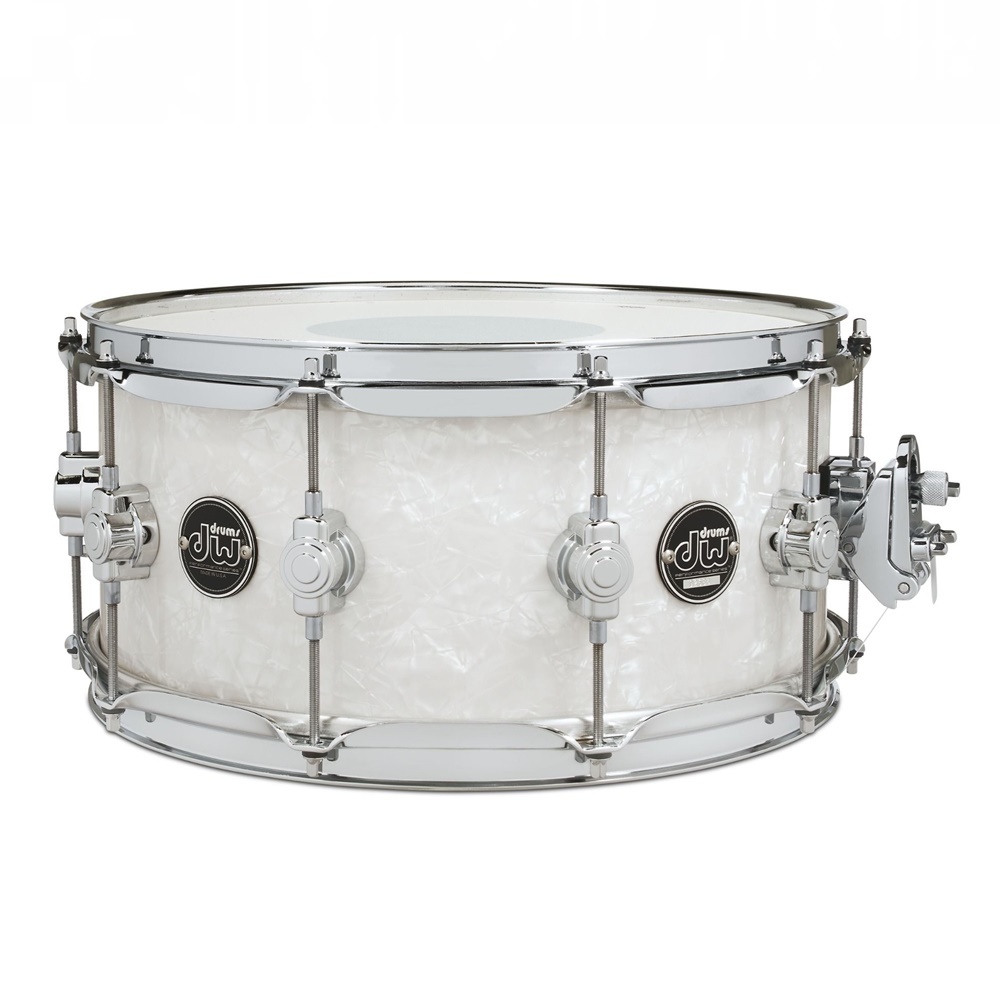 This 6.5x14 DW Performance Series snare drum in spectacular White Marine Finish Ply wrap is a quality DW maple snare at an affordable price. Dont let the price fool you. The thick, 10-ply DW HVX maple shell is articulate, bright, and cutting. Triple-flanged steel hoops let the shell ring out with rich tone. DW Performance Series drums feature DWs low-profile Quarter Turret lugs. If youre looking for a bangin snare on a modest budget, check out the DW Performance Series.