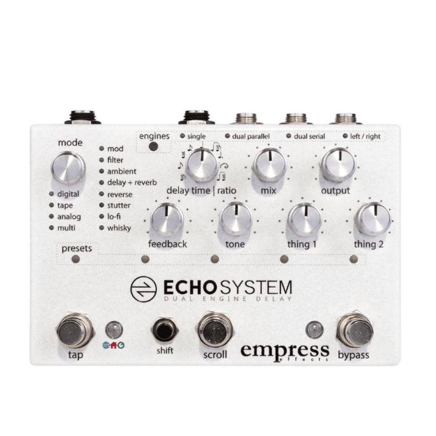 Spanning the gamut of known delay possibilities and beyond, the Echosystem could be the ultimate delay-crafting tool. Faithful emulations of classics like digital, tape and analog delays are numerous, as well as Empress’ own take on each of these delay styles. Moving beyond the traditional, the vast amount of sonic ground the Echosystem can cover becomes apparent. Check out the ambient modes when you’re feeling chilled out, or perhaps a visit to the multi tap modes for a taste of inspiration.