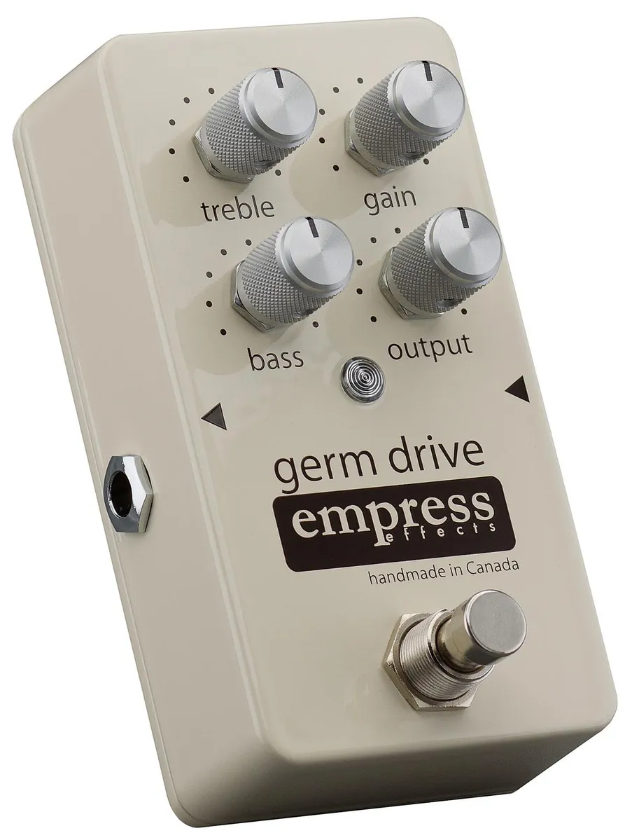 True to the tweed tube amps of the 50’s, the germ drive delivers warm, harmonically rich overdrive that cleans up with a twist of your volume knob. Its tube-like break-up sounds extremely natural and will enhance your sound without masking the original tone of your instrument.