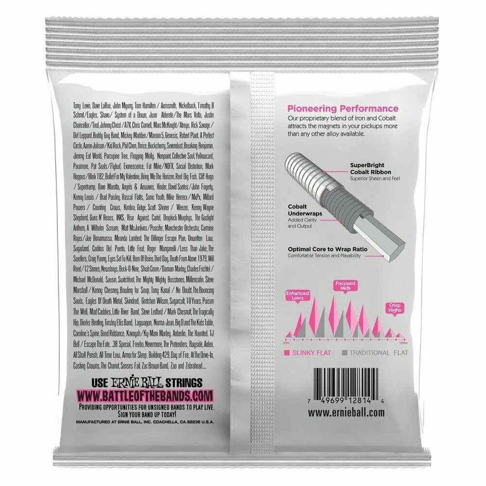 Ernie Ball Slinky Flatwound Bass Strings combine the smooth feel oftraditional flats with the modern power of Cobalt. Featuring a superbright Cobalt ribbon wrap, Ernie Ball’s optimal core to wrap ratiodeliver an innovative new bass string that features the tonal qualitiesof a round would with the silky smooth feel and fundamentals of aflatwound string.