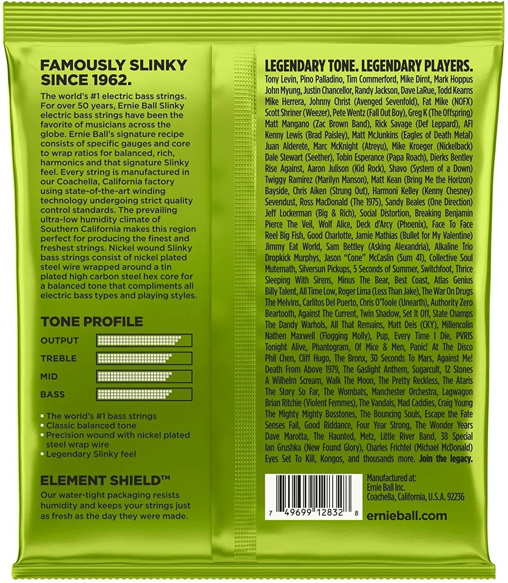 Ernie Ball Regular Slinky Nickel-wound Medium -scale Bass Strings are a punchy-sounding option for your medium-scale bass. Made from nickel-plated steel (NPS) windings wrapped around tin-plated, hex-shaped steel core wire, Slinkys produce a well-balanced, all-around great sound, no matter what style you play.