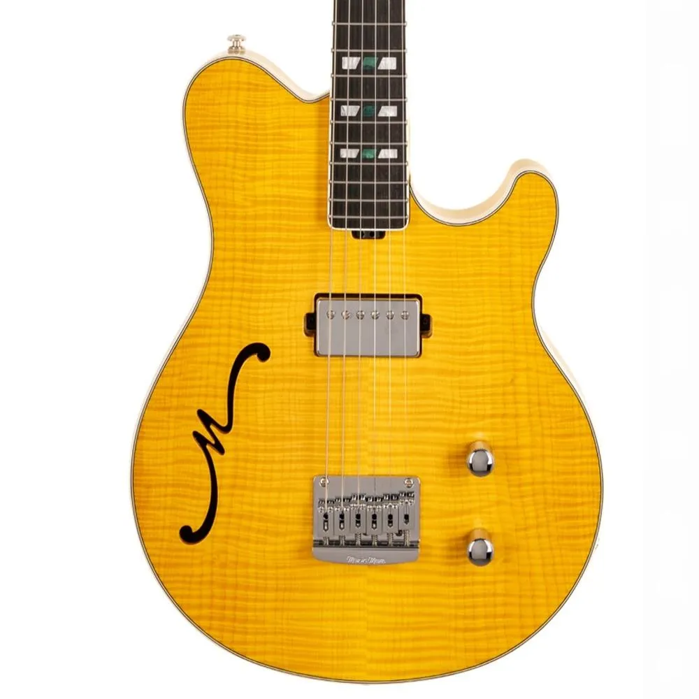 - Gorgeous flame maple top with unique M-shaped soundhole