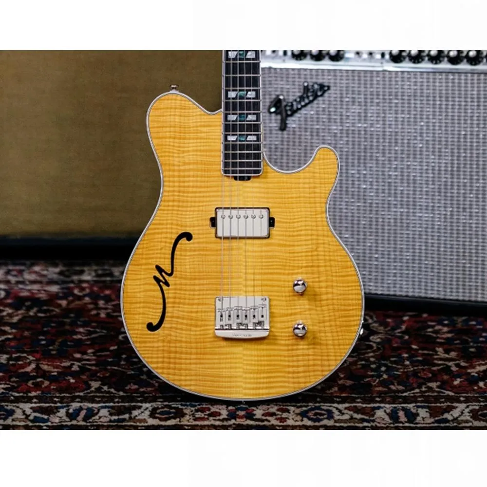 In the past, Music Man has released Ball Family Reserve Axis “Super Sport” limited editions — but never one like this! As much a jazz guitar as a lean, mean rock machine, the Ernie Ball Music Man BFR Axis Semi-Hollow is proof positive that a jazz box doesn’t have to be big and boxy. As compact and comfortable as any solidbody, this sleek semi-hollowbody electric guitar gives you the finest craftsmanship, tonewoods, and electronics available across the Ernie Ball Music Man lineup. A toneful and lightweight chambered basswood body is topped by an eye-popping flame maple top with a unique M-shaped soundhole. A single chrome-covered, direct-mount humbucker, augmented by master volume and tone controls, is stationed perfectly to gain access to the widest range of tonality to suit your every musical endeavor. This Ernie Ball Music Man BFR Axis Semi-Hollow is one of only 30 instruments available worldwide, so our advice is to jump on it. This is the one you’ve been waiting for!