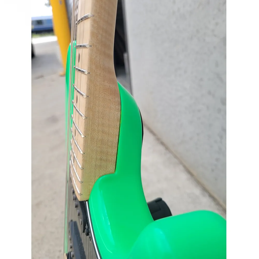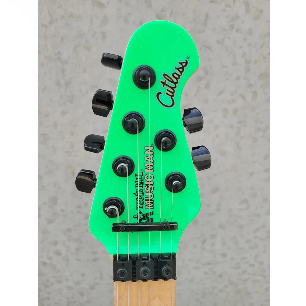 This eye-catching collectible represents the premium tone, appointments, and features only the BFR collection can bring to the solidbody electric guitar. This Special “Eighties” Edition Ernie Ball Music Man BFR Cutlass HSS blends a classic design with modern appointments for comfortable, reliable performance. Most striking are the highly figured maple neck and fingerboard, which deliver stunning looks and nuanced playability. A trio of great-sounding pickups — two custom-wound Music Man single-coils and a custom DiMarzio zebra humbucker — equips this guitar for wide musical deployment, with the added expressiveness of a Music Man Floyd Rose licensed locking vibrato. The passive electronics setup (three pickups, master volume and tone, and a 5-way blade) may seem conventional, however, this guitar is equipped with Music Man’s innovative Silent Circuit, which delivers clean, hum-free signal — including true single-coil tone — across all five switch positions. Adorned with an arresting neon finish, matching headstock, and black hardware; the Special Eighties Edition BFR Cutlass HSS won’t be around for long, so you’d better grab it while you can!