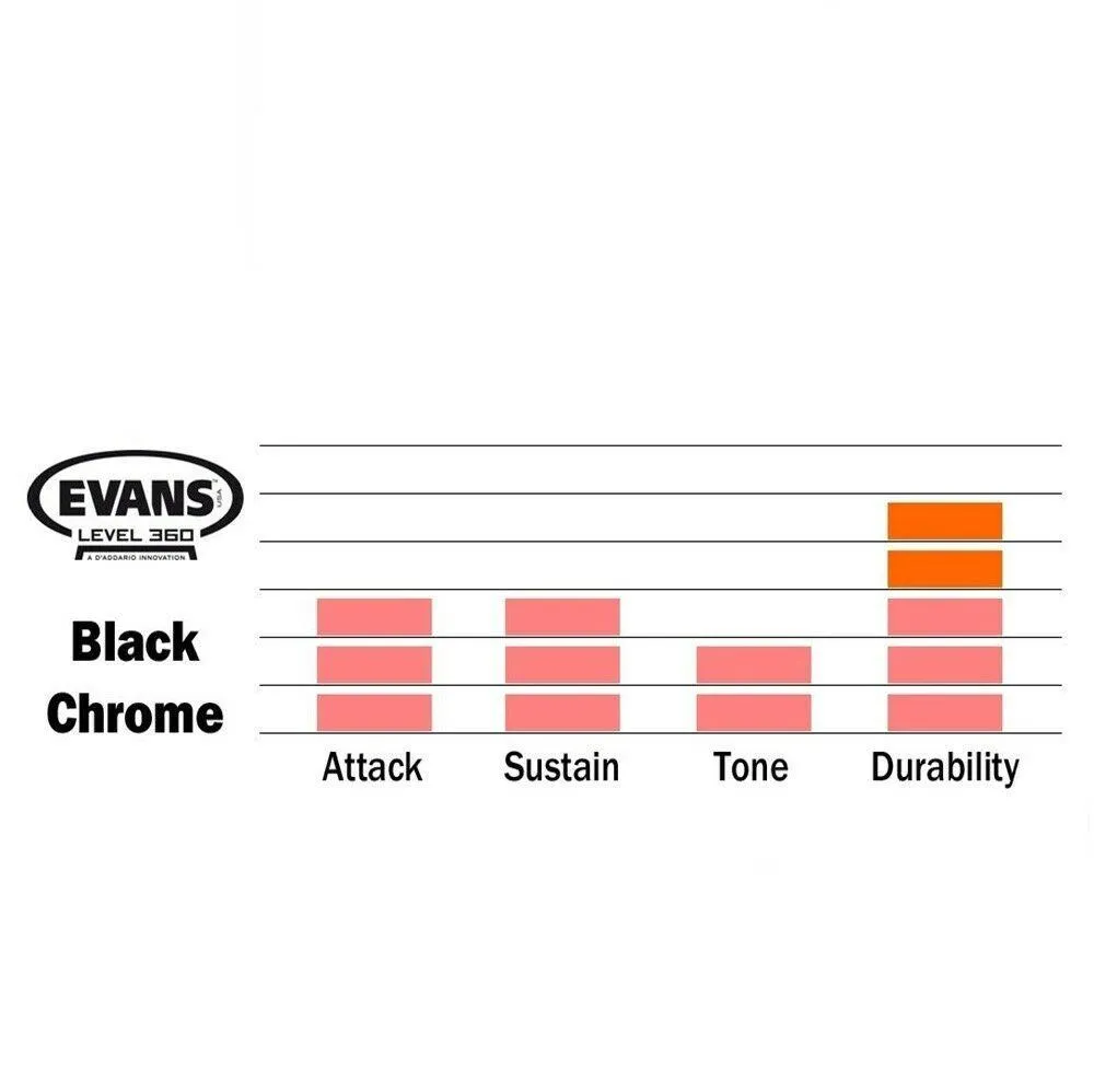 The Evans engineering and design teams were focused on discovering theperfect combination of materials for Black Chrome. They experimentedwith unique film pairings, custom adhesives and out-of-the-box designconcepts to produce a drumhead of superior tone and durability.