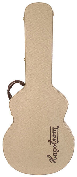 The case exterior is made of durable vintage tan Tolex, with a gracefully emblazoned Hagstrom logo. Seams are reinforced with heavy brown stitching, with tasteful leatherette stitched sides. The rectangular flat cases feature dark brown leatherette end caps with distinctive brown stitching. The shaped cases feature a rigid, arched top and form-fitting design.
