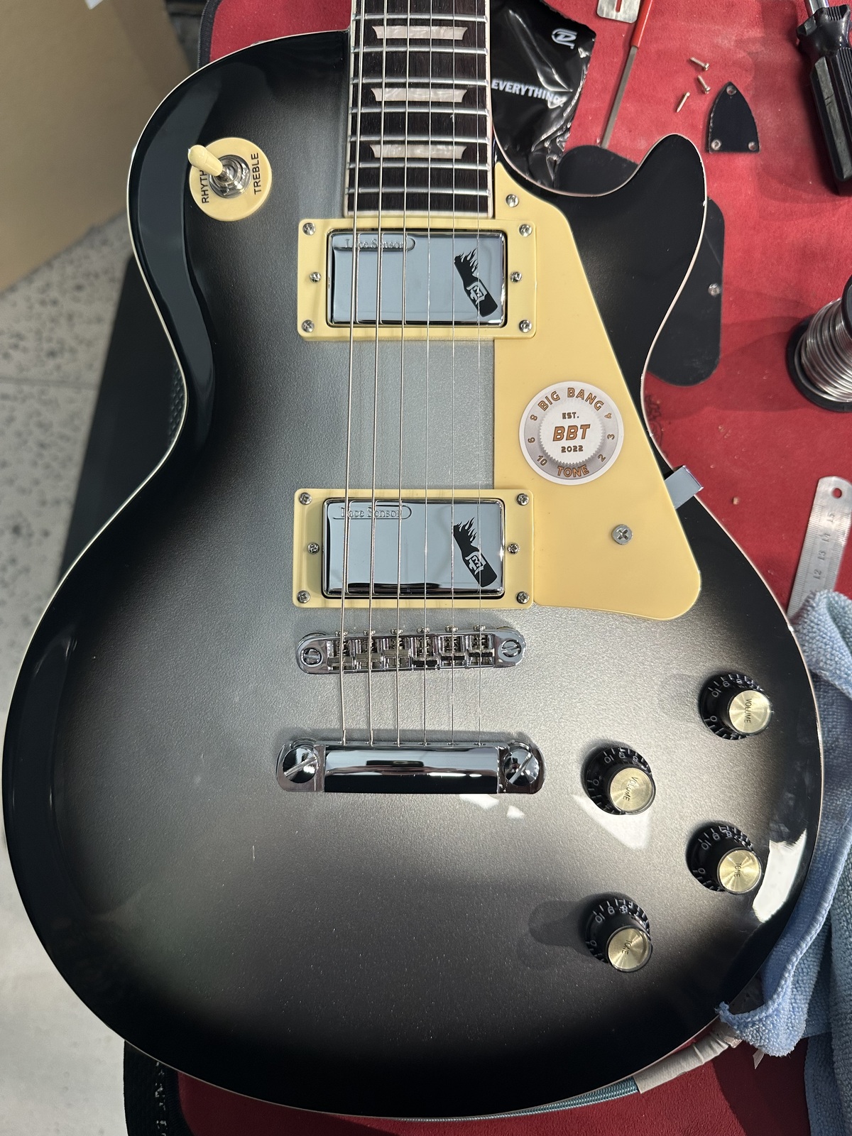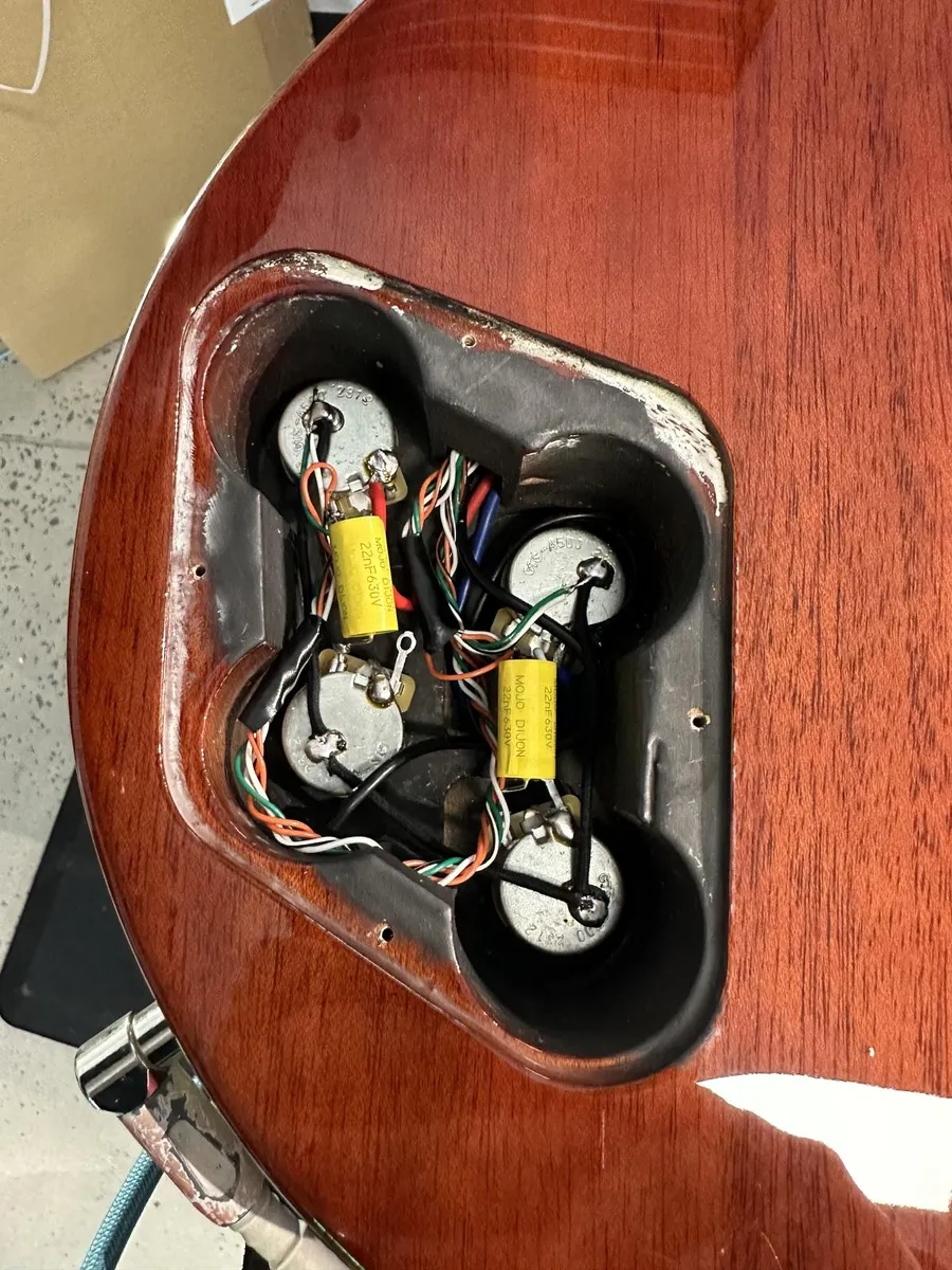 Hot Rodded with a BBT wiring kit, CTS pots Hosco Caps, swithcraft jack set of Lace D3 D'Agitator Humbuckers.Gibson knobs, shilding.
