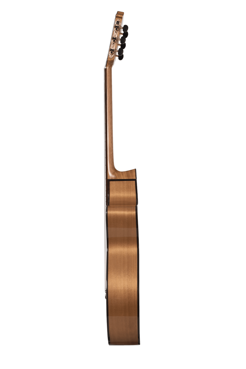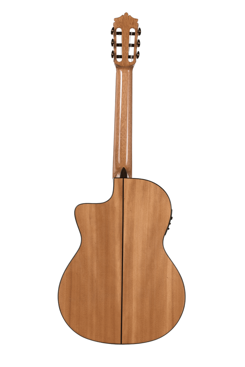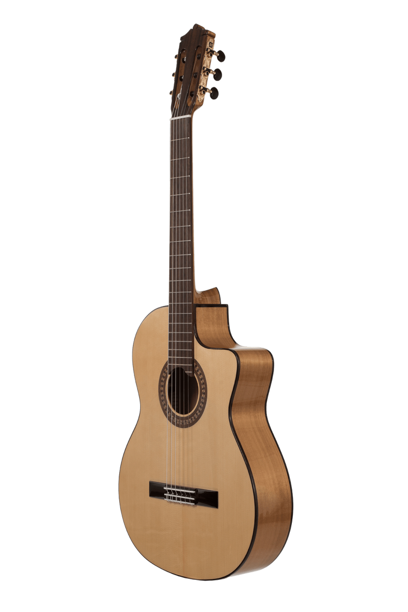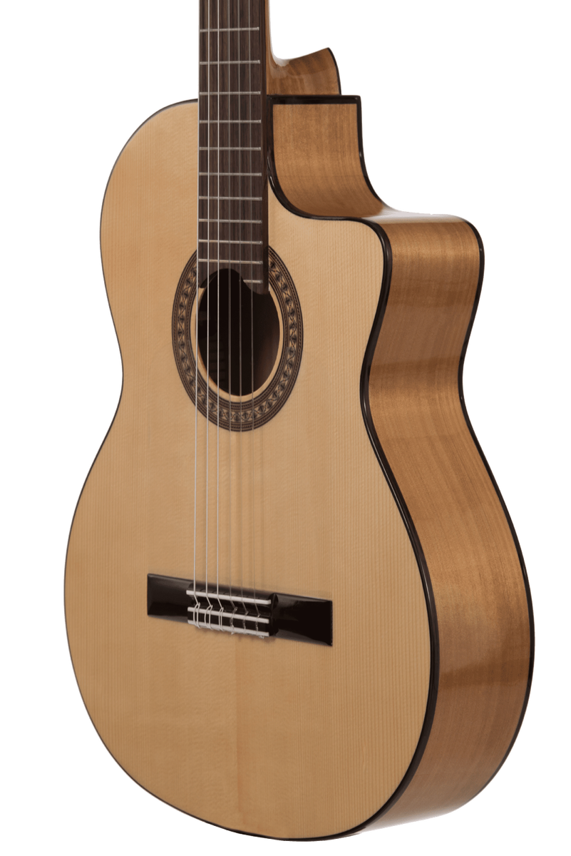 Acoustic electric cutaway version of the Katoh KF flamenco. This guitar’s combination of solid spruce top and agathis back and sides match up as a perfect combination for the aspiring flamenco player. Tone is great as it cuts through without compromising the bass register. The KF is designed and built to sound great whilst withstanding the rigours of robust flamenco playing. Cutaway gives excellent access to higher frets.